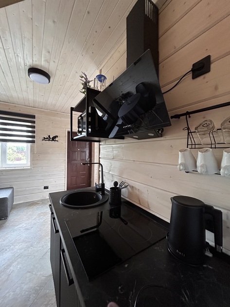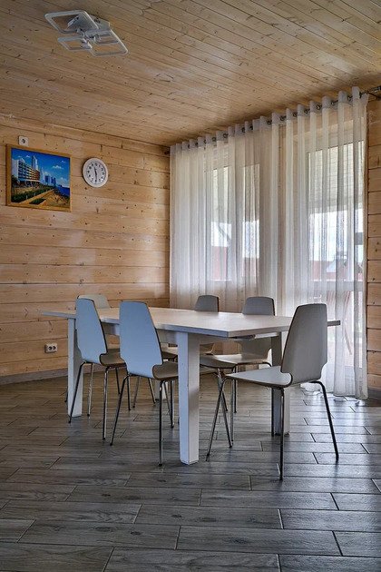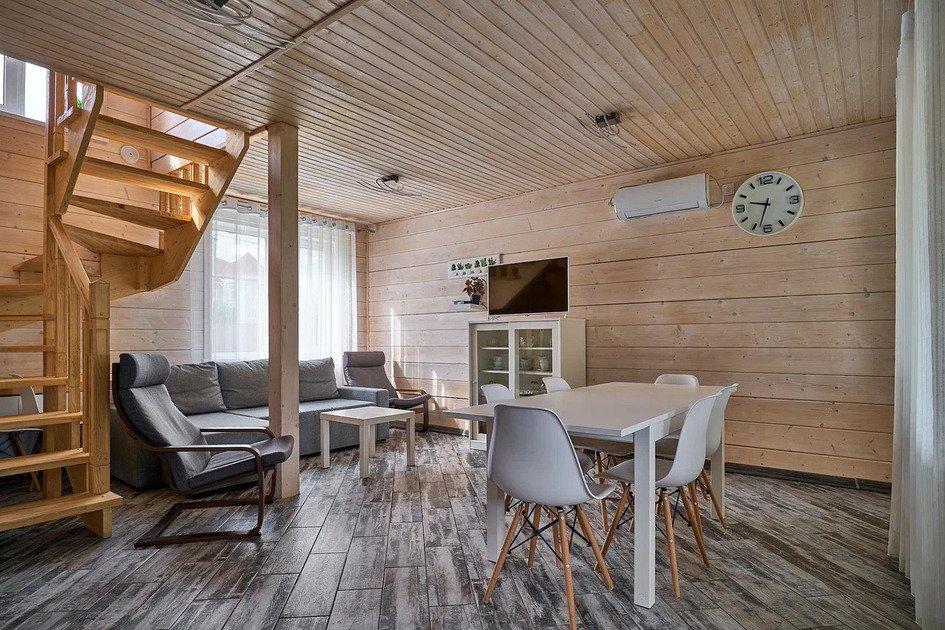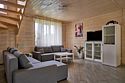 На первом этаже коттеджа располагается просторная гостиная с двумя удобными диванами, мягкой мебелью и телевизором, где можно расслабиться или поиграть в настольные игры. Диваны могут использоваться как дополнительные спальные места. Гостиная совмещена с зоной кухни. На кухне имеется вся необходимая бытовая техника (варочная панель, вытяжка, холодильник, кофеварка и чайник, СВЧ и ПММ) и посуда для приготовления пищи, а также столовая посуда и приборы. Большой обеденный стол уместит компанию до 12 человек.