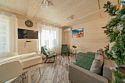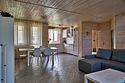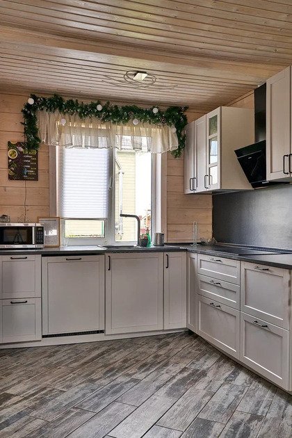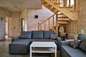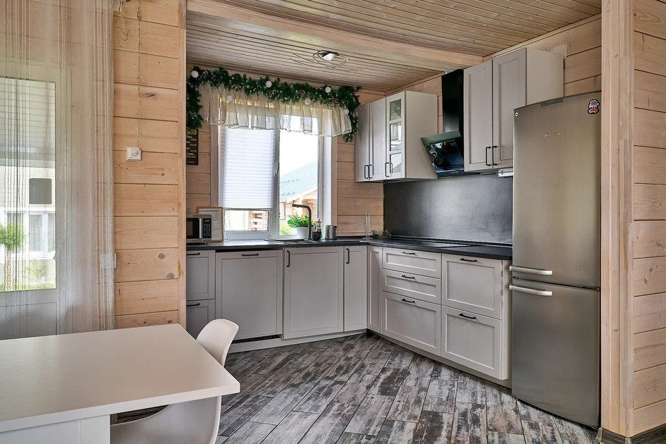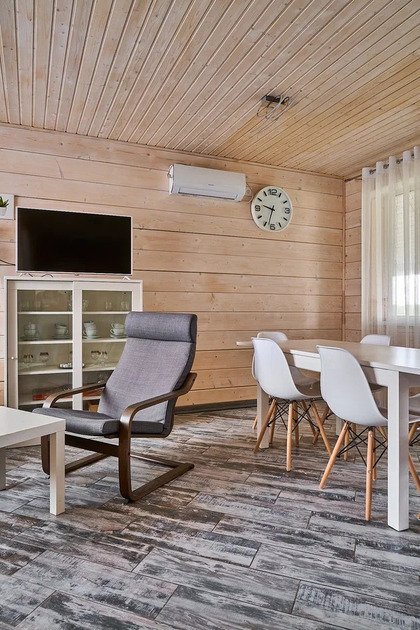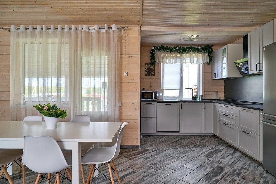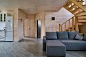 Площадь данного коттеджа составляет 121 кв. м, он полностью оборудован для комфортного пребывания: просторная кухня со всей необходимой техникой (варочная панель, СВЧ, ПММ, холодильник, кофеварка, электрический чайник, вытяжка), большой обеденный стол, стулья для 9 гостей и открытая терраса, имеющая выход из гостиной комнаты.