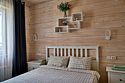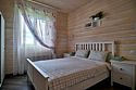 Коттедж площадью 131 кв. м полностью оборудован для комфортного пребывания: просторная кухня со всей необходимой техникой (варочная панель, СВЧ, ПММ, холодильник, кофеварка, электрический чайник, вытяжка), большой обеденный стол, стулья для 9 гостей и открытая терраса. В данном коттедже имеется пять изолированных спален. На втором этаже располагаются 4 спальни + кроватка для младенца. На первом этаже имеется одна спальня с односпальным диваном. Для размещения двух дополнительных гостей в гостиной имеется раскладной диван.