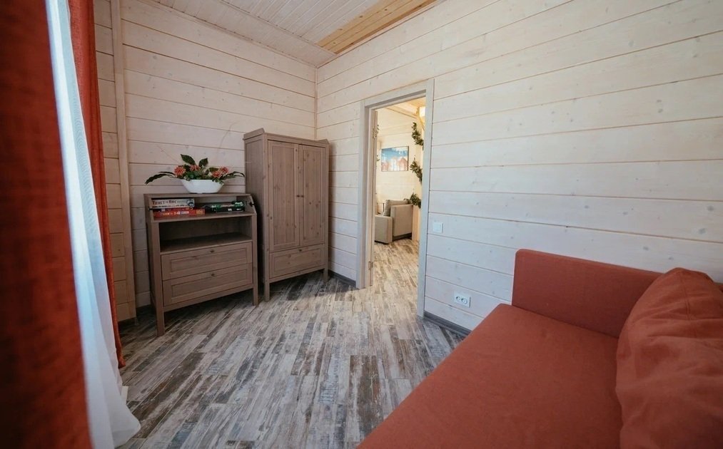В данном коттедже имеются четыре изолированные спальни: три спальни с двуспальными кроватями и одна спальня с односпальной кроватью. В одной из спален есть детская кроватка-маятник. Для размещения двух дополнительных гостей в гостиной имеется раскладной диван.