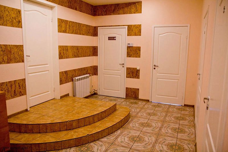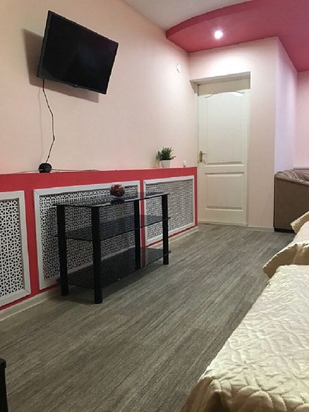 В номере двухспальная кровать, телевизор и тумба. К услугам гостей общая ванная комната.