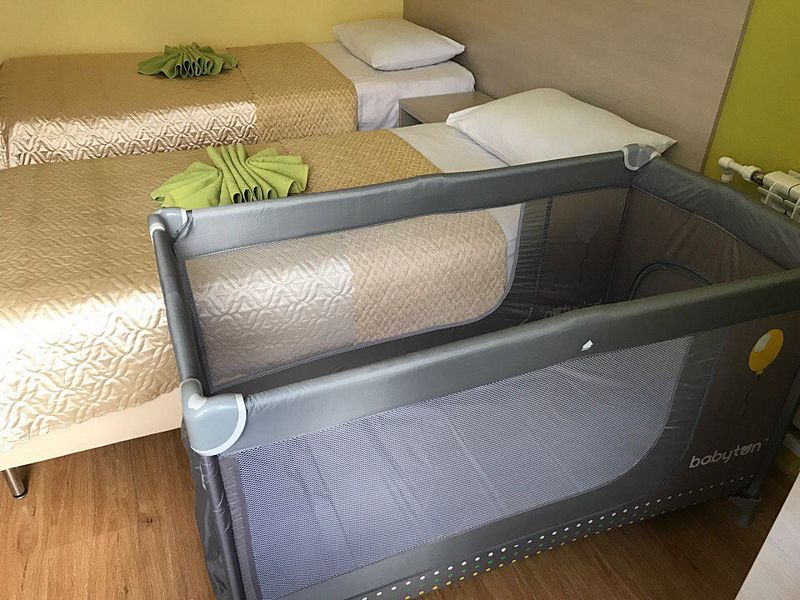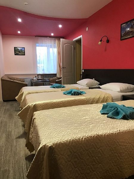 Семейный номер состоящий из 4 кроватей и дивана, телевизор с плоским экраном и спутниковыми каналами.