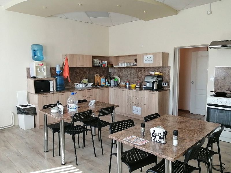 Кухня общая: плита электрическая, холодильник, чайник, микроволновка, обеденная зона.