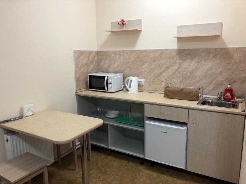 прихожая, санузел с душем, туалетные принадлежности, мини-кухня, стол,