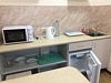 стол, табуреты, холодильник, микроволновая печь, чайник, посуда,чай,