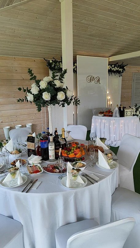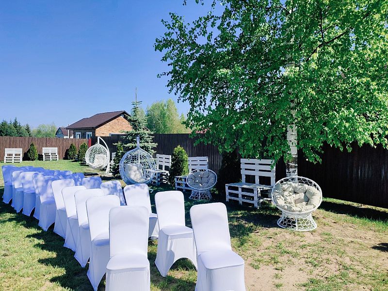 Территория идеально подходит для выездных свадебных регистраций, банкетных мероприятий и активных развлечений, которые можно организовать по индивидуальному плану. В беседке установлены электрические конвекторы для обогрева, а также есть стационарный туалет и возможность подключения электроприборов.