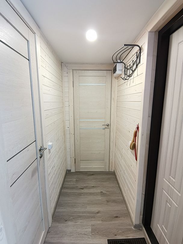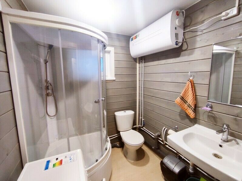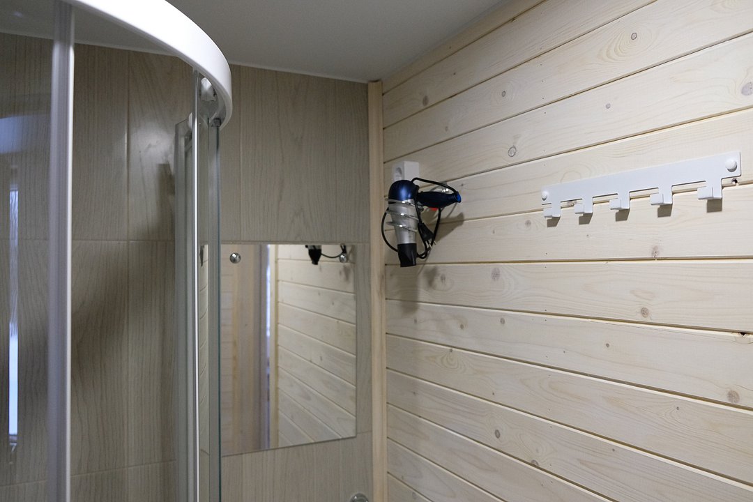 В санузле — душевая кабина, туалет, раковина, набор полотенец для каждого гостя, зеркало, фен, ручной отпариватель по запросу.