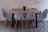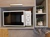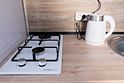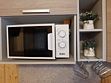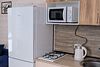 На кухне холодильник с морозильным отсеком, чайник, микроволновка, газовая поверхность, комплект посуды и столовых приборов на четыре гостя, обеденный стол и четыре стула.