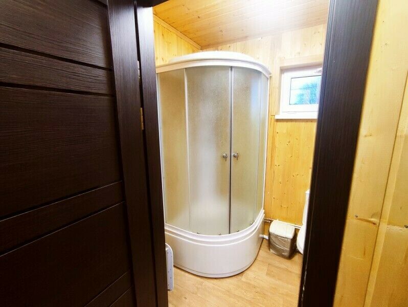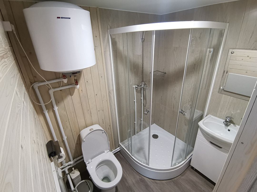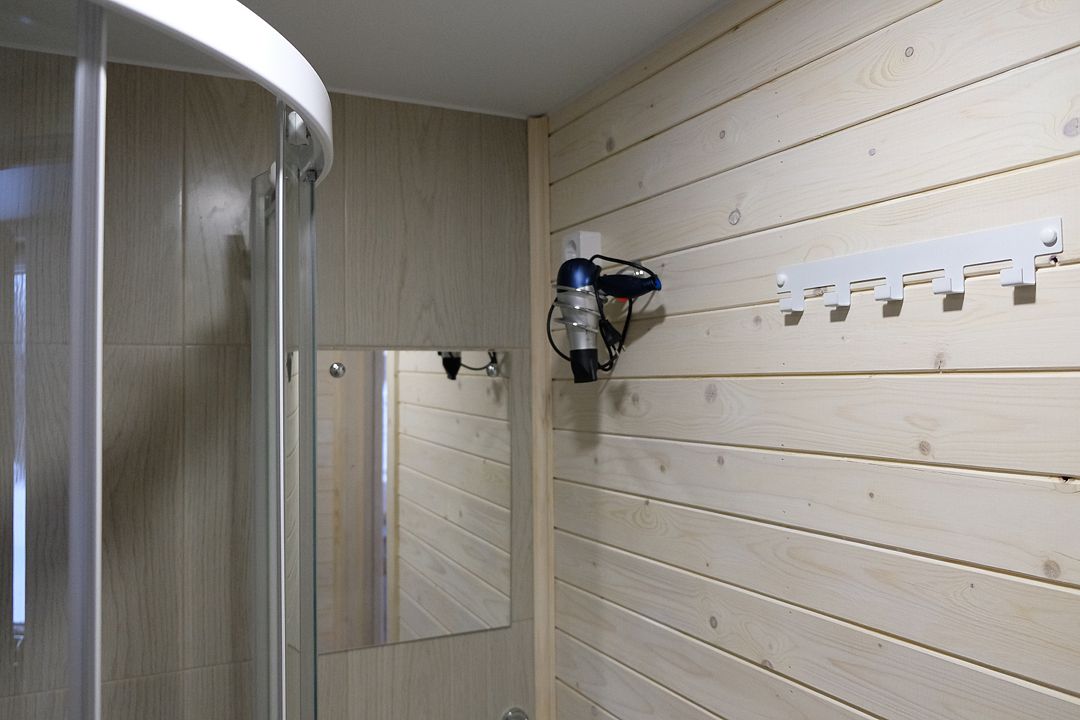 В санузле — душевая кабина, туалет, раковина, набор полотенец для каждого гостя, зеркало, фен, ручной отпариватель по запросу. У каждого дома своя площадка с уличной мебелью и мангалом (угли, шампура и розжиг можно купить на месте). По всей территории работает WiFi.