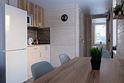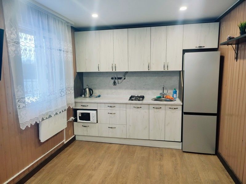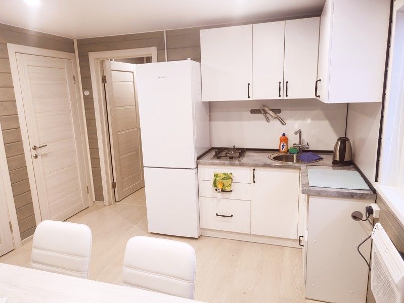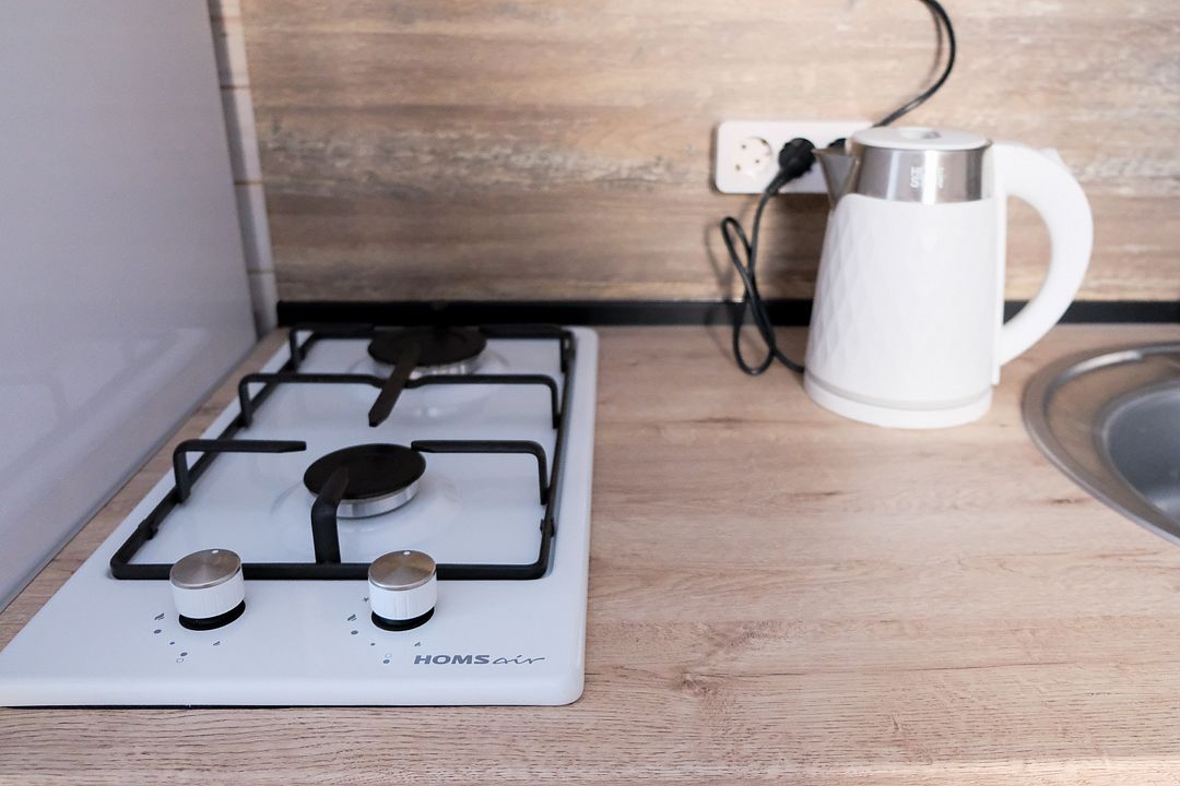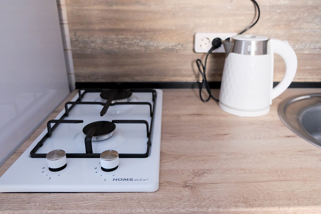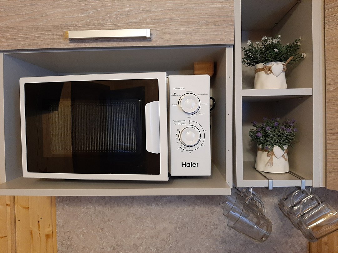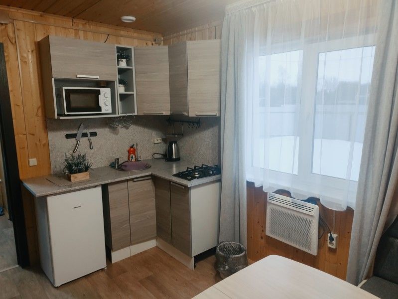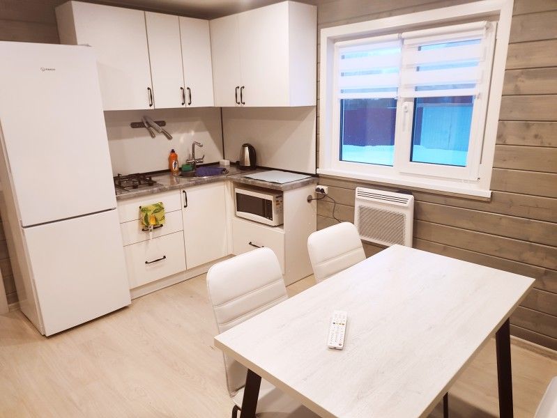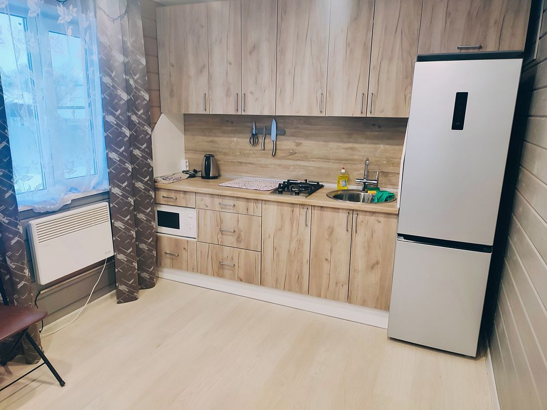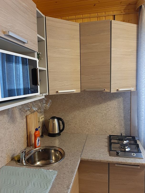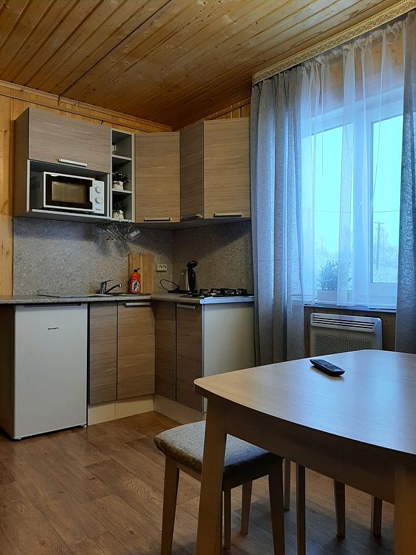 На кухне холодильник с морозильным отсеком, чайник, микроволновка, газовая поверхность, комплект посуды и столовых приборов на четыре гостя, обеденный стол и шесть стульев (дополнительные предоставляются по запросу).