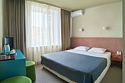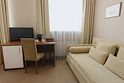 Вернулись с экскурсии к 14 часам, получили ключи и пошли заселяться в номер. Номер располагался на 5 этаже. В фойе этажа расположен уютный бар со столиками и кожаными диванами. Сам номер небольшой, но уютный. Слева при входе диван, за ним столик с небольшим телевизором, под столиком маленький холодильник. Напротив дивана - большая двуспальная кровать. У телевизора чайник, две чашки, пакетики чая и две бутылочки воды. Над телевизором - кондиционер. При входе - шкаф, в шкафу два халата, тапочки, губки для обуви, расчески. В ванной - душевая кабина, полотенца и полный набор косметики (шампуни, гели для душа, кондиционер, зубной набор, пилочки и шапочки для душа). Мы оставили вещи в номере и пошли на обед. На обед в первый день давали готовые блюда. Он был не очень вкусный: салат из капусты кислый, также был кислый борщ, не провисший, а именно с кислым привкусом. На второе котлеты по-пожарски в сухарях, очень твердые и сухое пюре. Чай черный/зелёный в пакетах и печенье.
