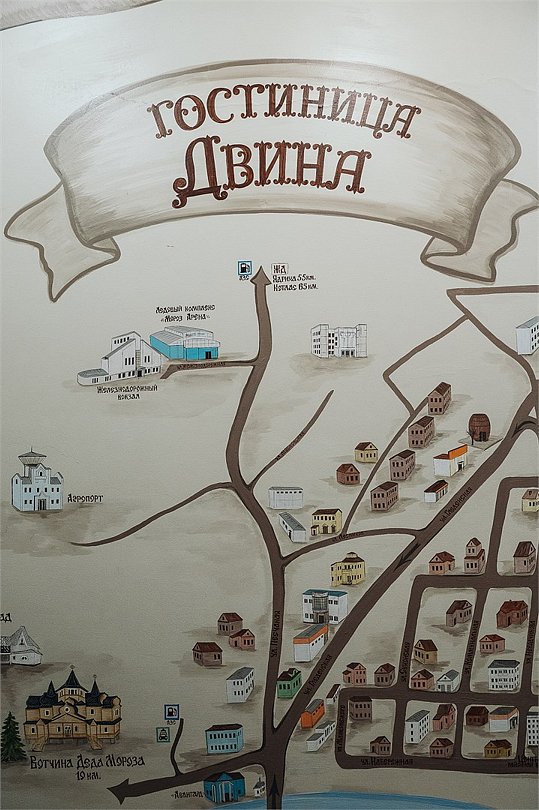 Гостиница «Двина», расположенная в самом центре города Великий Устюг, входит в линию исторической застройки по улице Красной. В шаговой доступности основные достопримечательности города – музеи и памятники древнерусского зодчества, а также резиденция деда Мороза, напротив – небольшой сквер с церковью Сретения Господня, до визитной карточки города – набережной реки Сухоны – 5 минут ходьбы. В 10 минутах езды на автомобиле находится аэропорт местного значения, откуда совершаются рейсы в Череповец и Санкт-Петербург. Ближайший крупный город – Котлас расположился в 50 километрах.