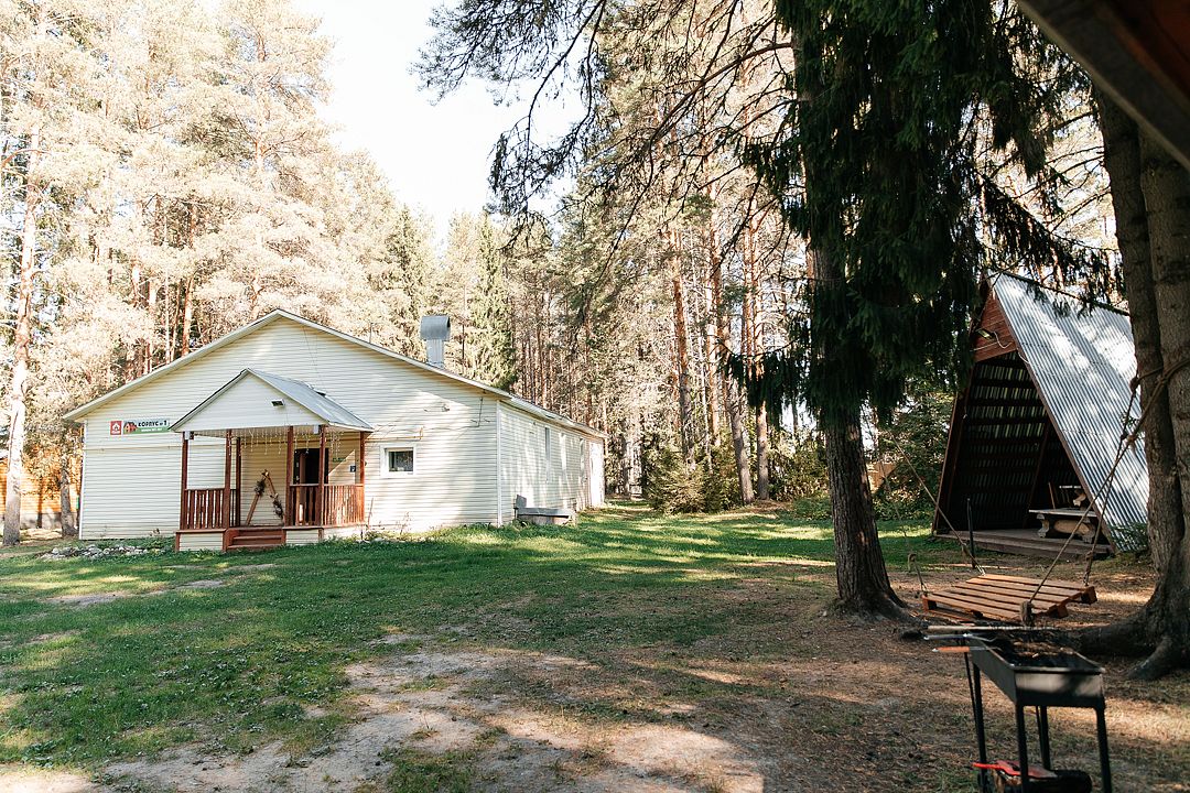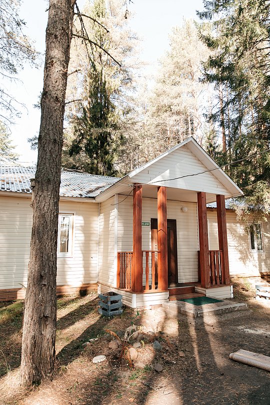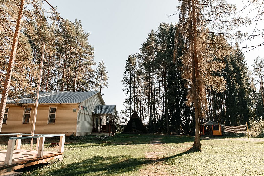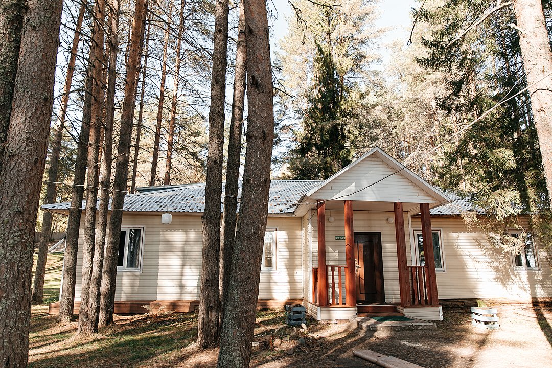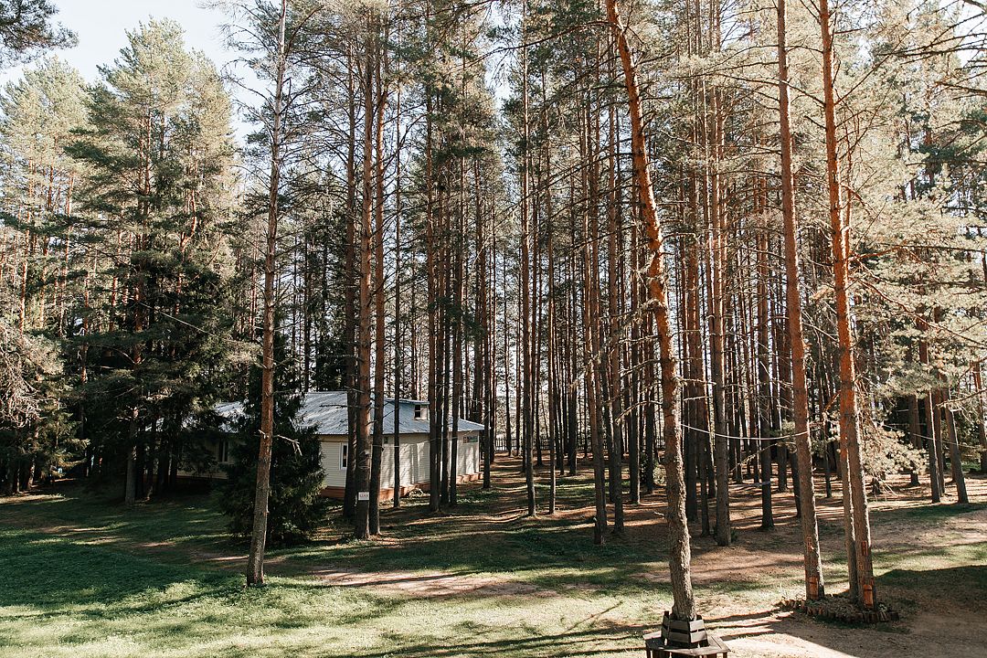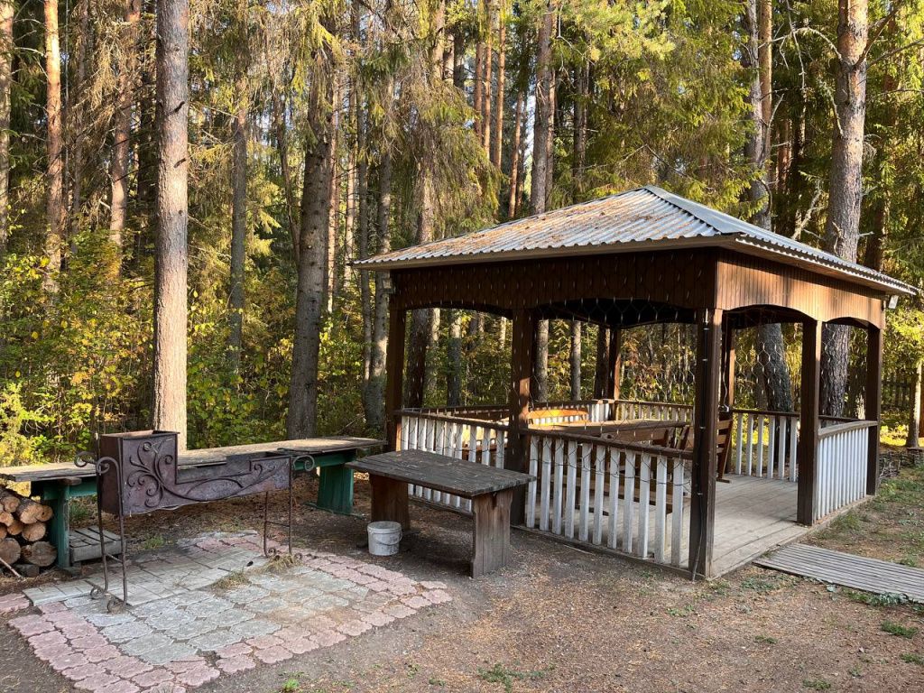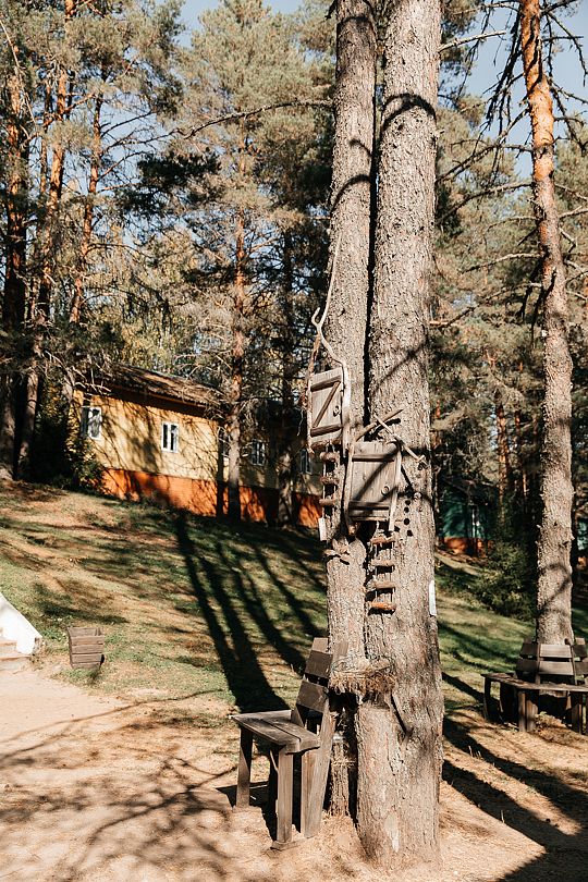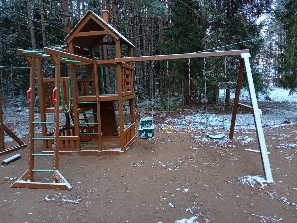 На территории есть просторная детская площадка с качелями, лазательными лестницами и канатами для развития ловкости и координации. Живописный лес вокруг создает уютную атмосферу.