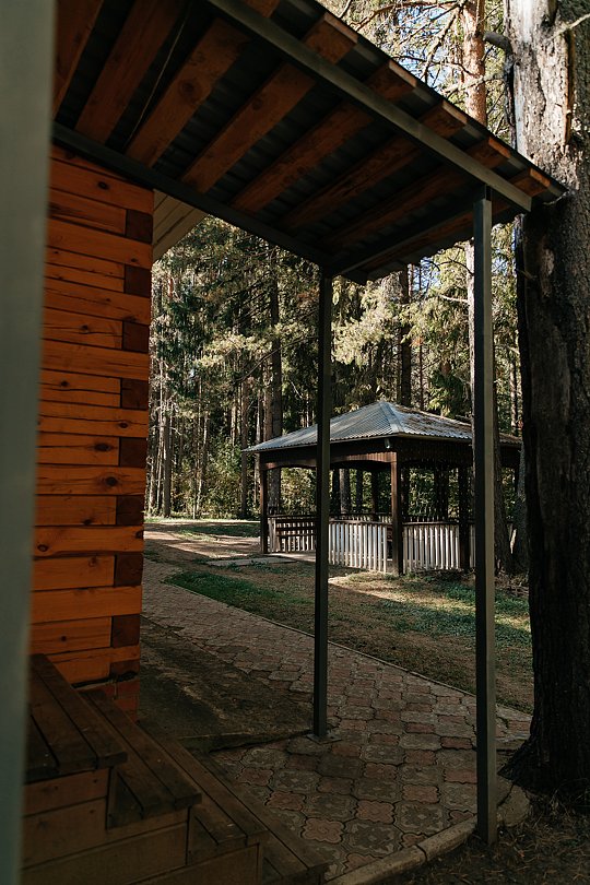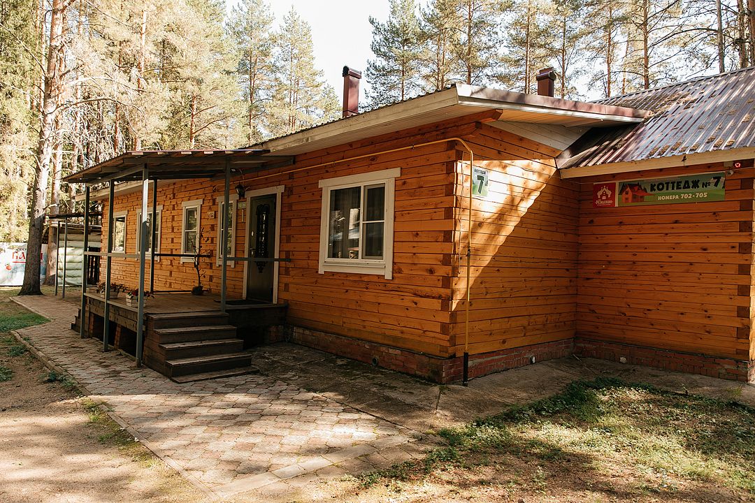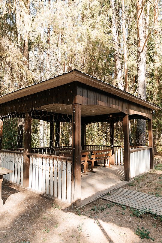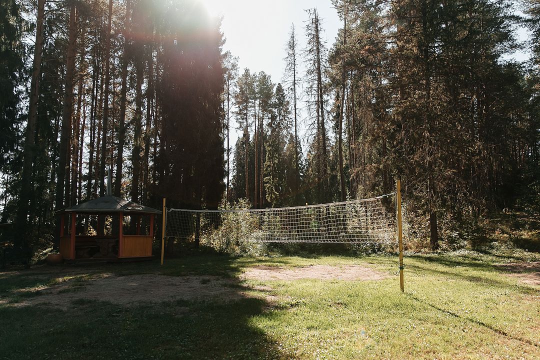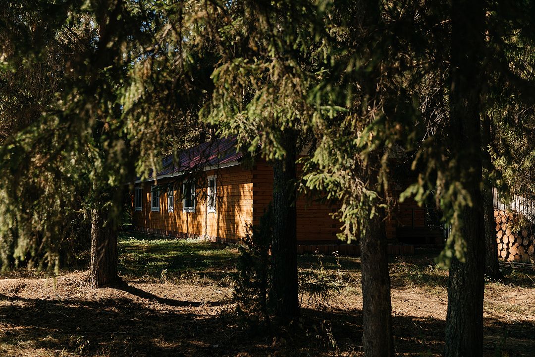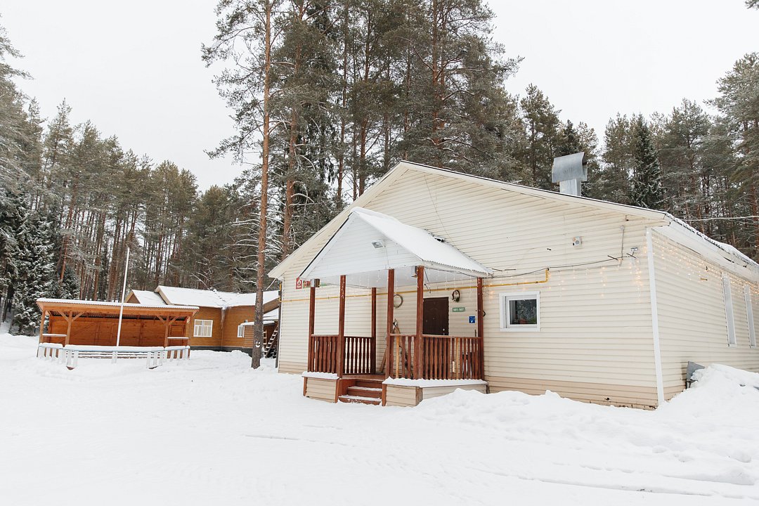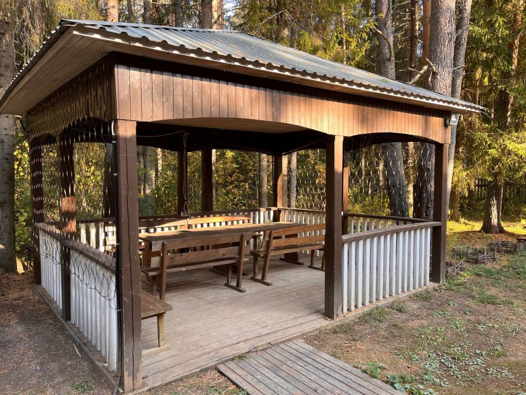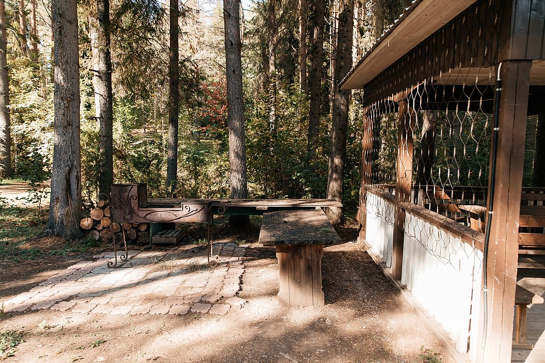 На территории есть просторная детская площадка с качелями, лазательными лестницами и канатами для развития ловкости и координации. Живописный лес вокруг создает уютную атмосферу.