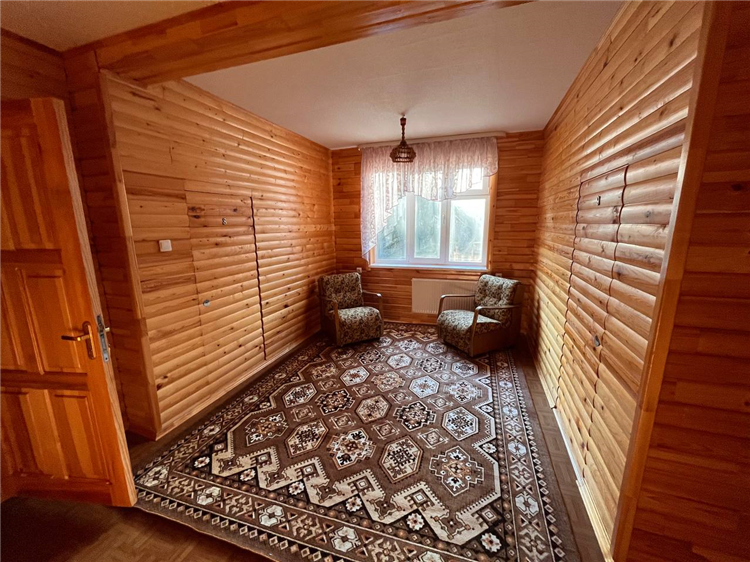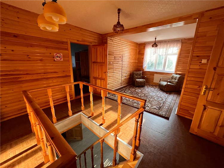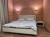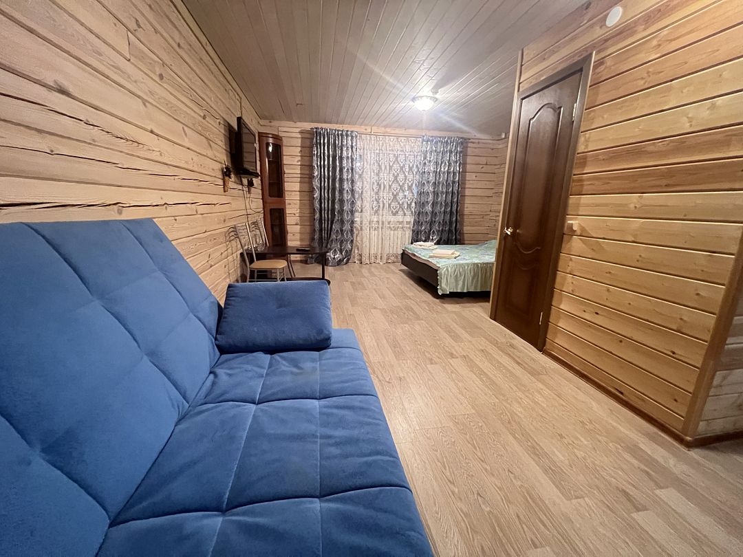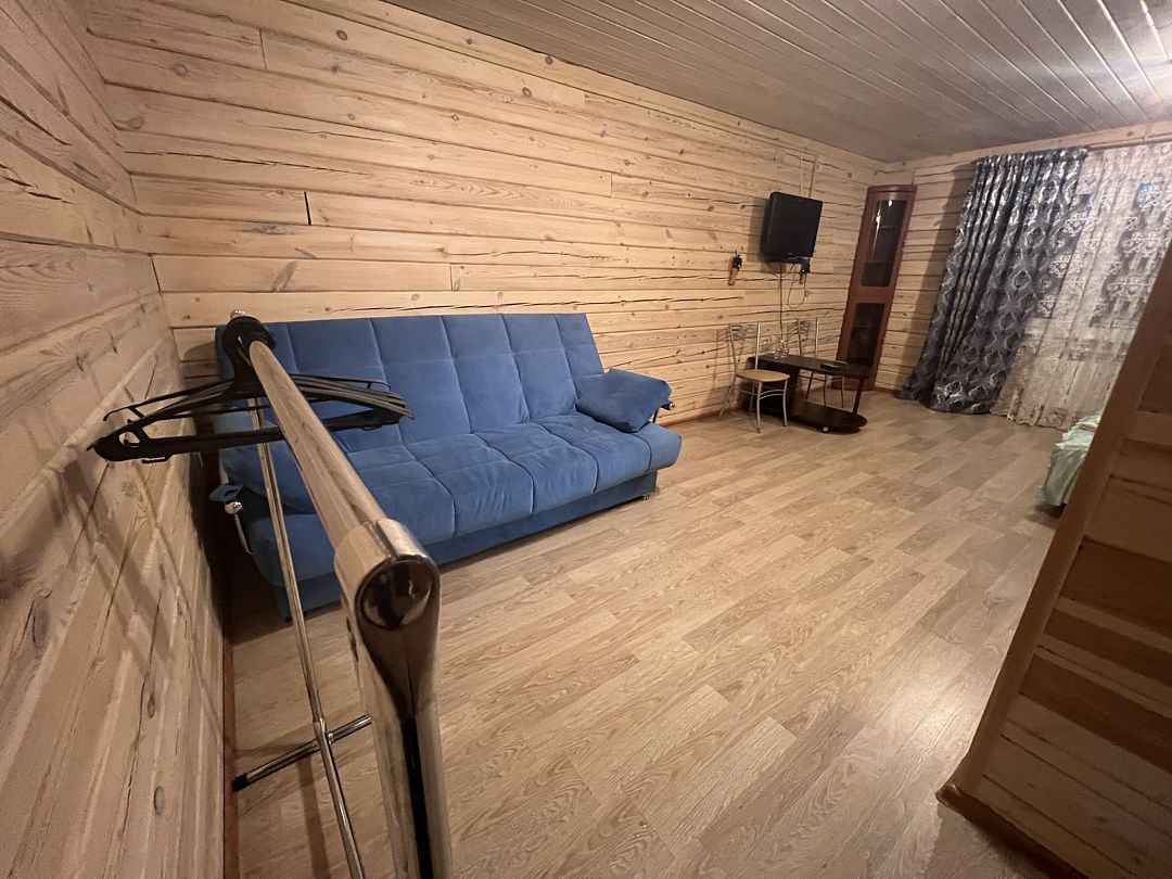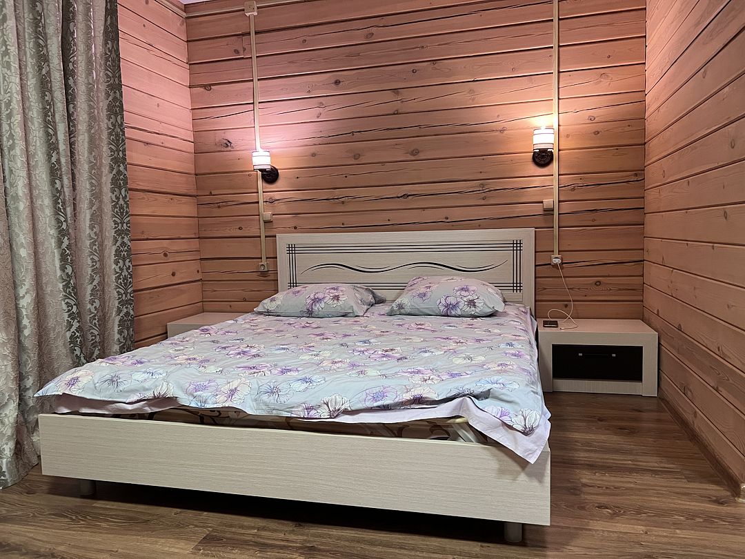 Коттедж включает четыре просторные комнаты, каждая из которых оборудована удобными кроватями и мебелью для хранения вещей. В комнатах есть как односпальные, так и двуспальные кровати, что позволяет гибко организовать размещение гостей. Интерьеры выполнены в уютном деревянном стиле, создающем теплую атмосферу загородного отдыха.