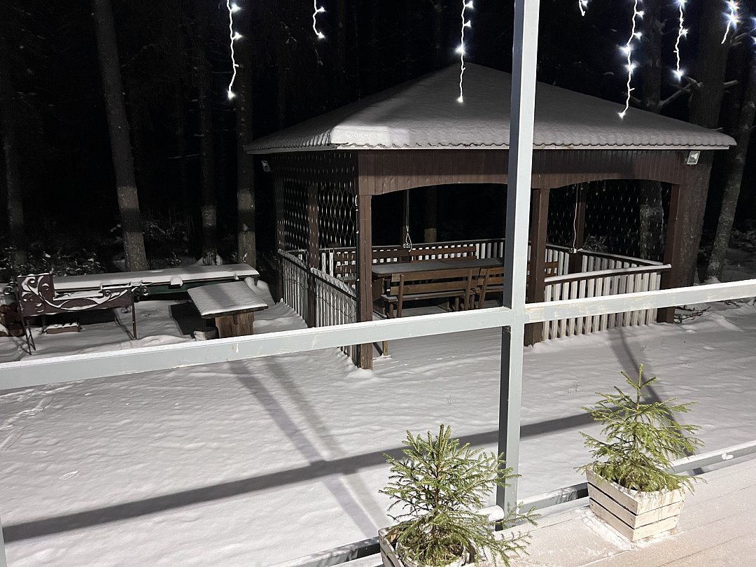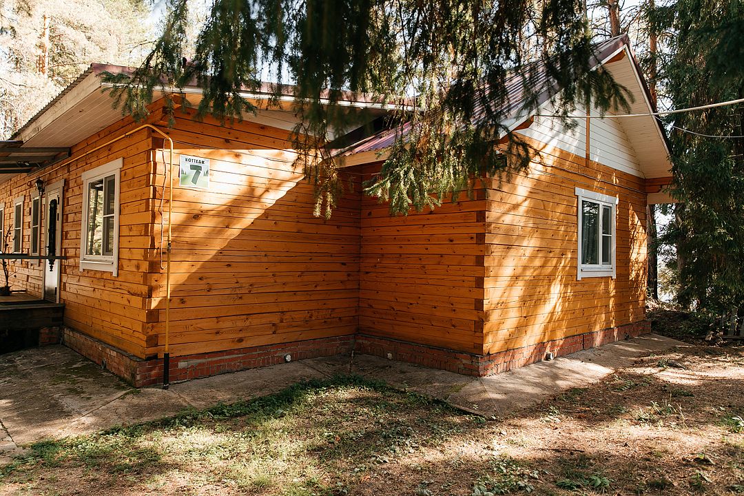 Коттедж расположен в окружении соснового леса, предлагая уникальную возможность провести время на свежем воздухе. Просторная терраса перед домом прекрасно подойдет для вечерних посиделок или утреннего кофе.