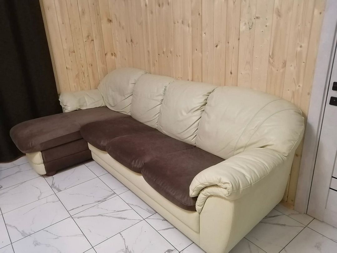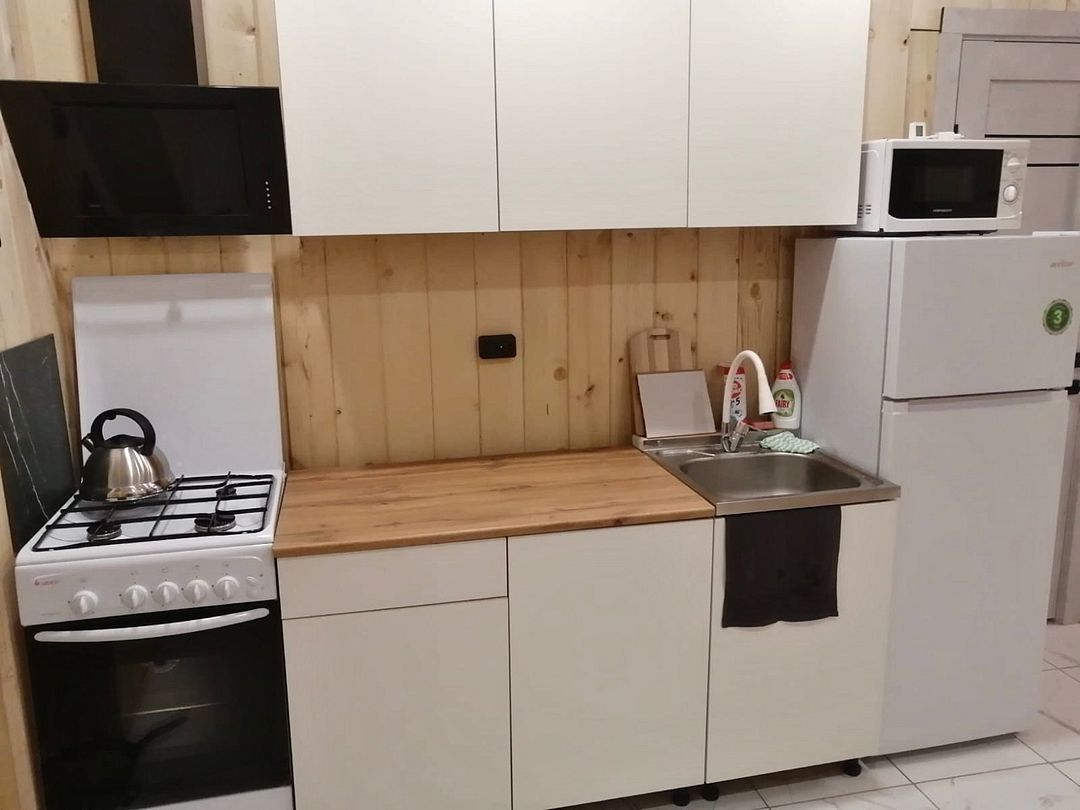 Уютная большая кухня-гостиная: удобный диван-кровать, кресло-кокон, просторный обеденный стол со стульями, холодильник, микроволновая печь, электрическая плита, телевизор и Wi-Fi, музыкальная колонка (микрофоны), электрический чайник, современная посуда для готовки и сервировки.
