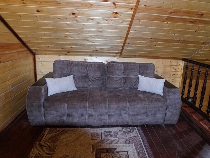 На 1 этаже: диван (разбирается на 1 чел.), телевизор, холодильник, микроволновая печь, чайник , комплект посуды на 4 чел., санузел.