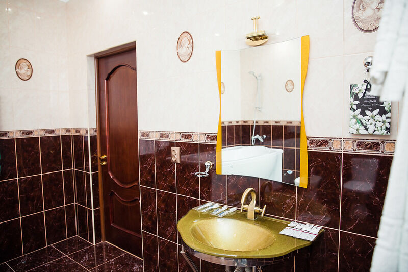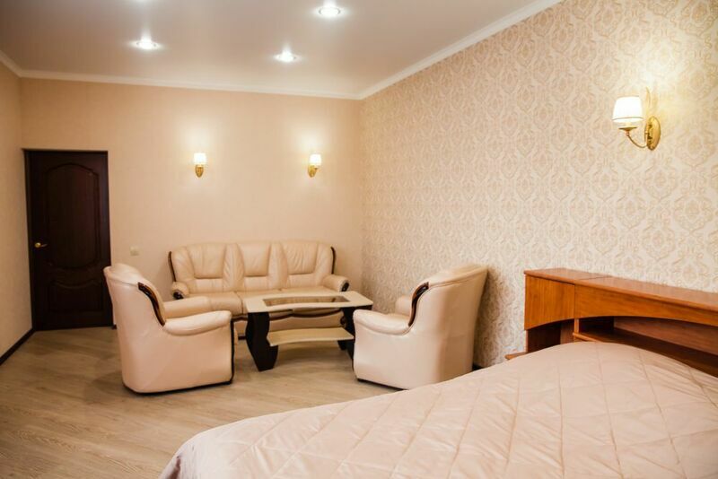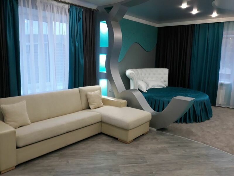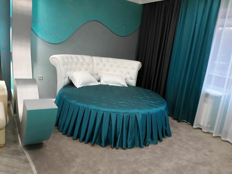 В номере: просторная круглая кровать, мягкий угловой диван, стол со стульями, шкаф для одежды, зеркало, санузел с душевой кабинкой и биде, балкон.