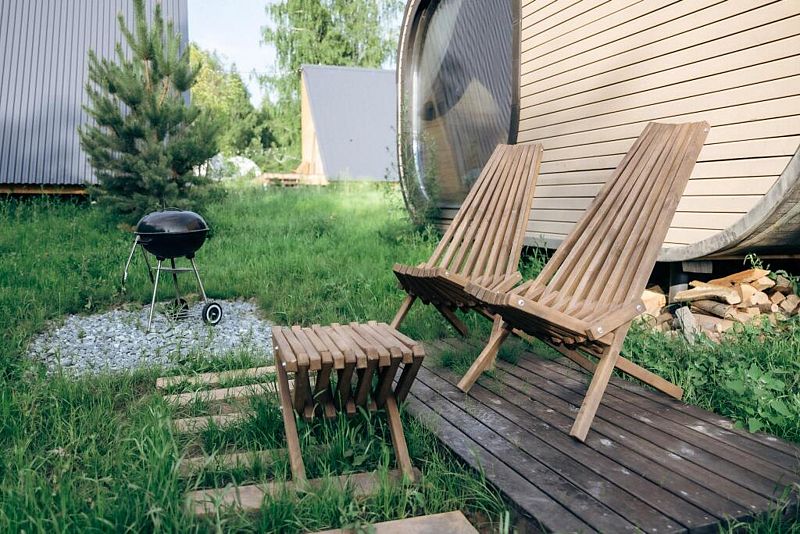 Мангал у каждого дома A-frame и мангальная чаша у каждого дома Naturi. Щипцы, веер, кочерга, решётка в комплекте.