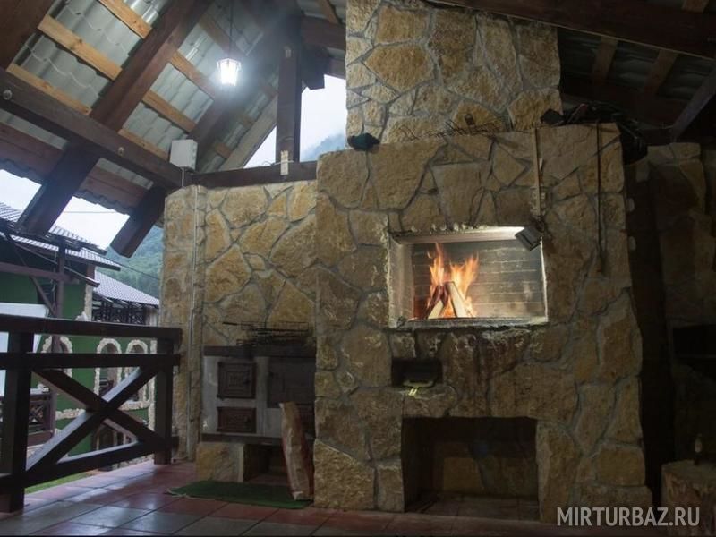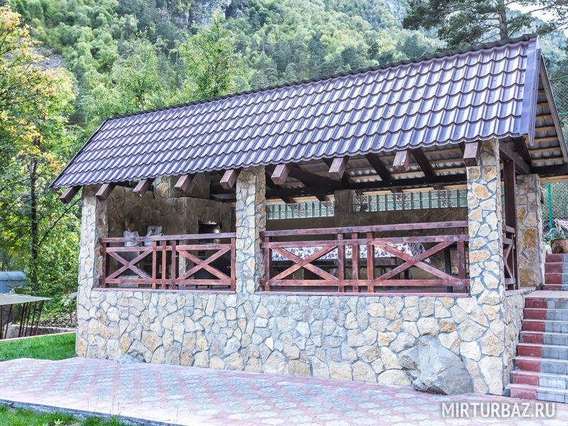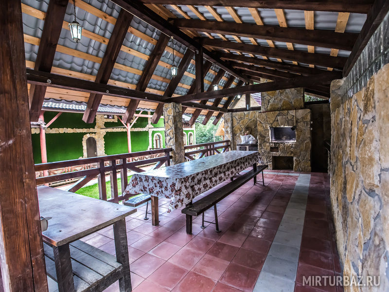 Для комфортного отдыха на свежем воздухе в кругу близких людей имеется роскошная каменная беседка, которая стоит отдельно от основного здания. В беседке есть столы, скамейки, электричество и мангал.