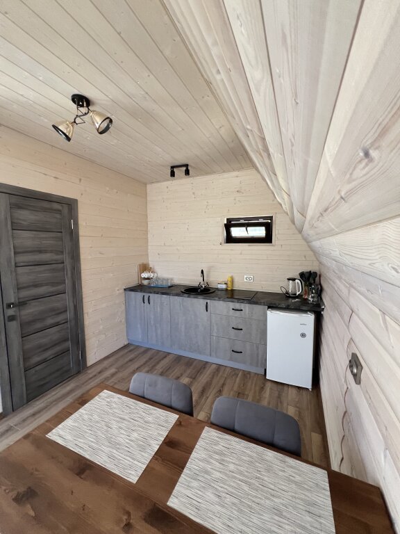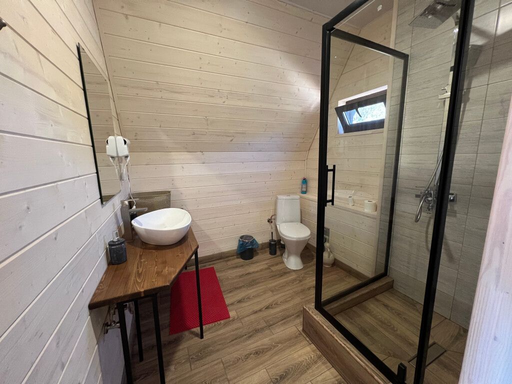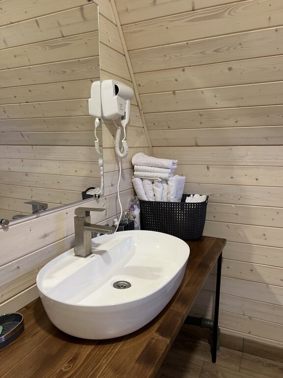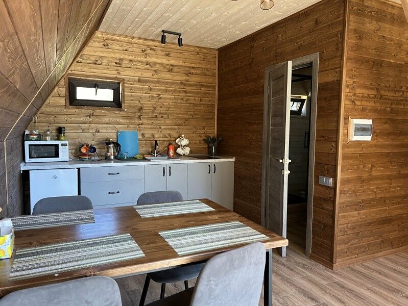 В домиках имеется все необходимое для комфортного проживания: чистое постельное белье, подушки, одеяла, санузел (душевые принадлежности, фен, полотенца), телевизор, Wi‑Fi, холодильник, мини-кухня, кухонная посуда, чайник (чай, кофе, сахар), одноразовые тапочки.