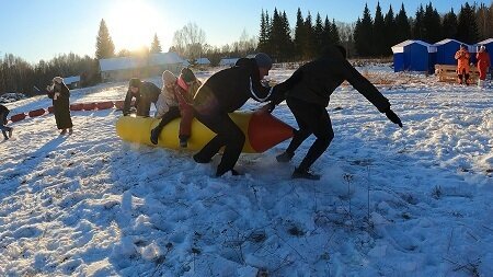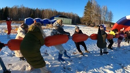 - гигантский хоккей, где клюшки, мячи и шайбы огромных размеров и управляться ими можно только сообща;
