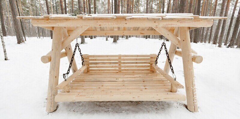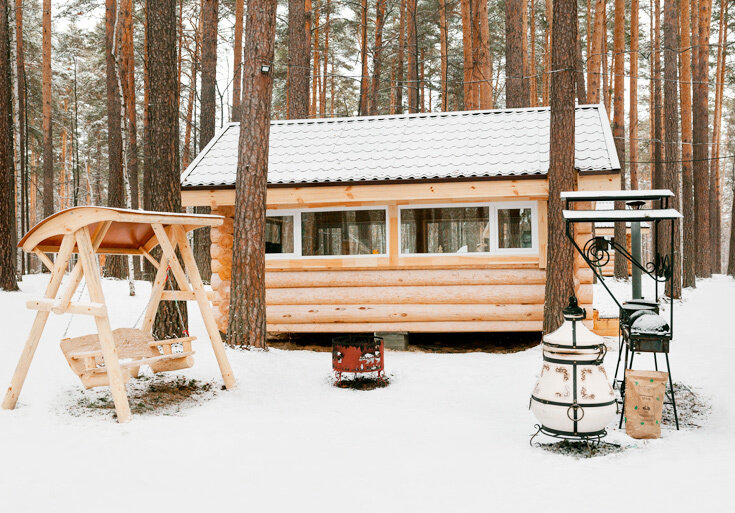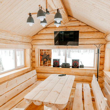 Беседка крытая, утепленная представляет собой крепкое бревенчатое сооружение, с террасой. Строения расположены в сосновом бору — вокруг лесной ландшафт. При нахождении в беседке, не теряется связь с природой. Эффект обеспечивают большие окна.