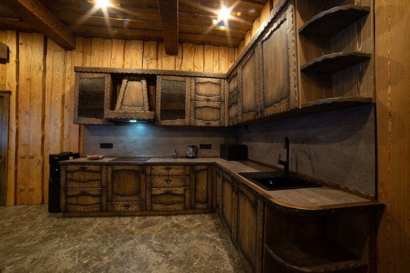 Большое европространство! Вместительный стол для большой компании 6 метров!Кухонный гарнитур в старорусском стиле из массива со всей необходимой техникой и ресторанной посудой!