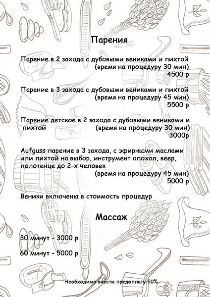 Инфраструктура: зона отдыха, дубовые веники, березовые веники3 часа включены в стоимость. Каждый последующий час — 1500 ₽.