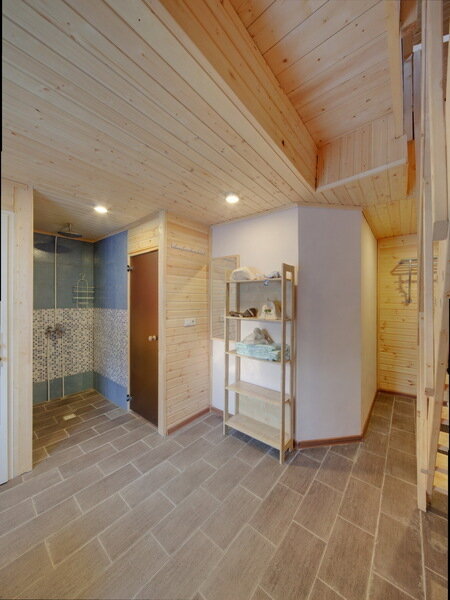 На втором этаже — 4 спальни, ванная комната, санузел. Размещение 12 спальных мест. Возможно 3 дополнительных места. Одна двуспальная кровать, 10 односпальных кроватей.