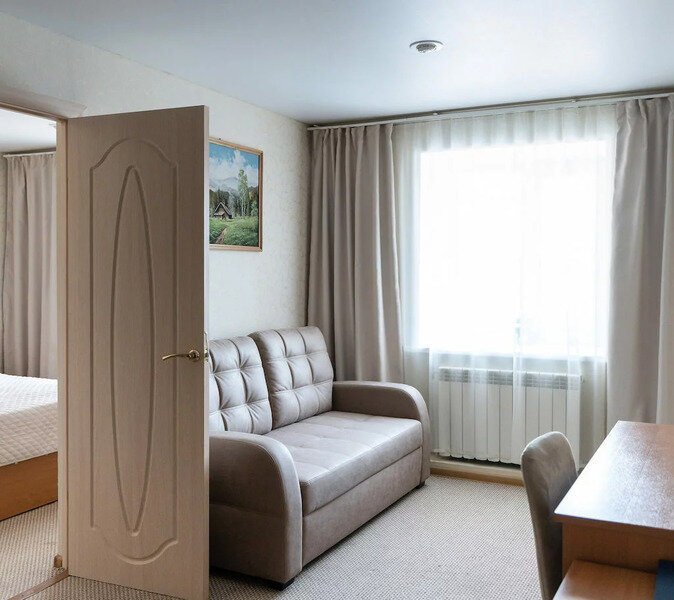 Де Люкс — просторный двухкомнатный номер с уютной спальней, гостиной с мягким диваном и рабочей зоной. Большие окна делают номер невероятно светлым и просторным, и позволяют любоваться видом на реку.
