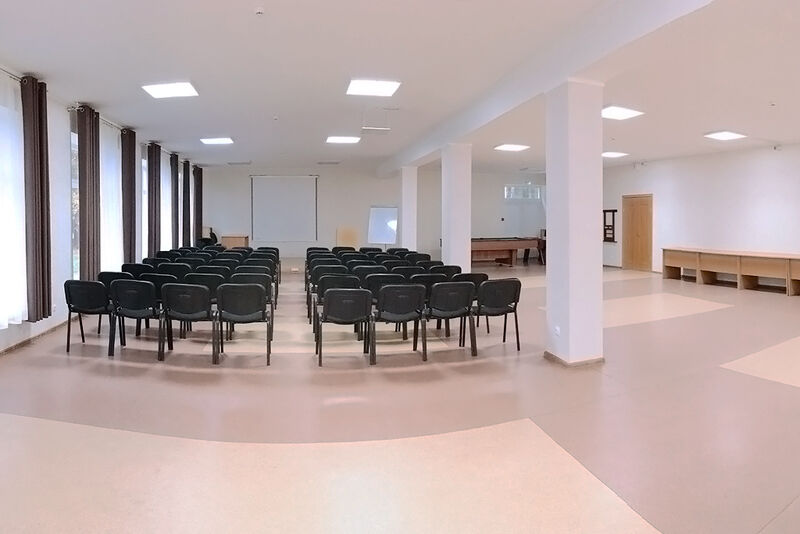 Конференц-зал в загородном комплексе «Солнечный остров» подходит для организации конференций, семинаров и других деловых мероприятий с рассадкой в театр — до 120 человек. Зал оснащен теплым полом и идеально подходит для проведения спортивных и йога мероприятий.