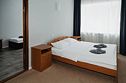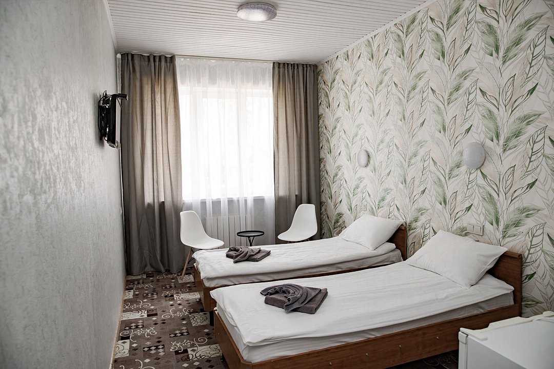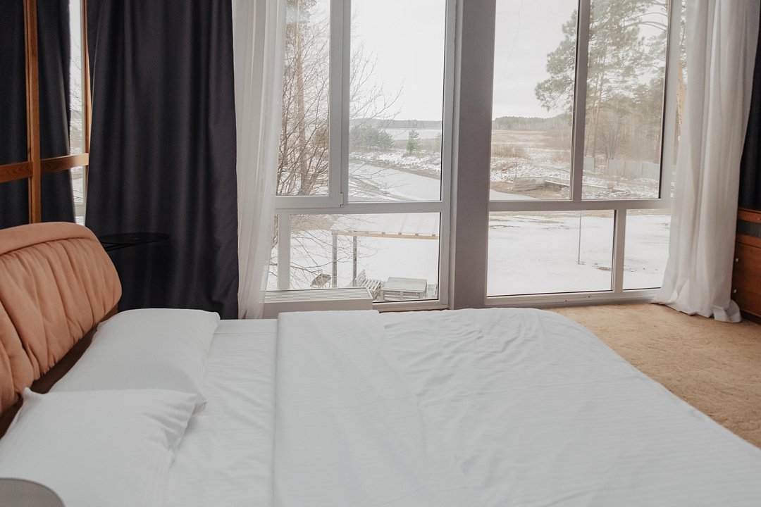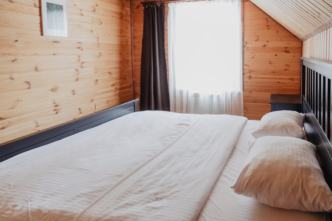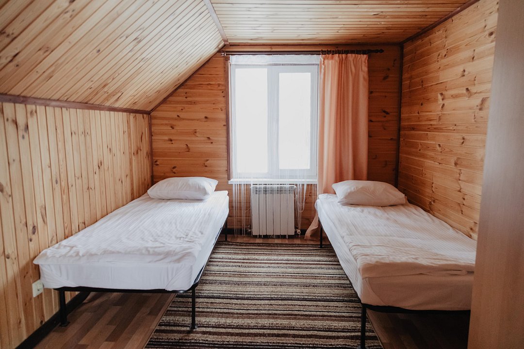 Уютный номер «Стандарт» в отдельном корпусе с видом на сосновый лес.