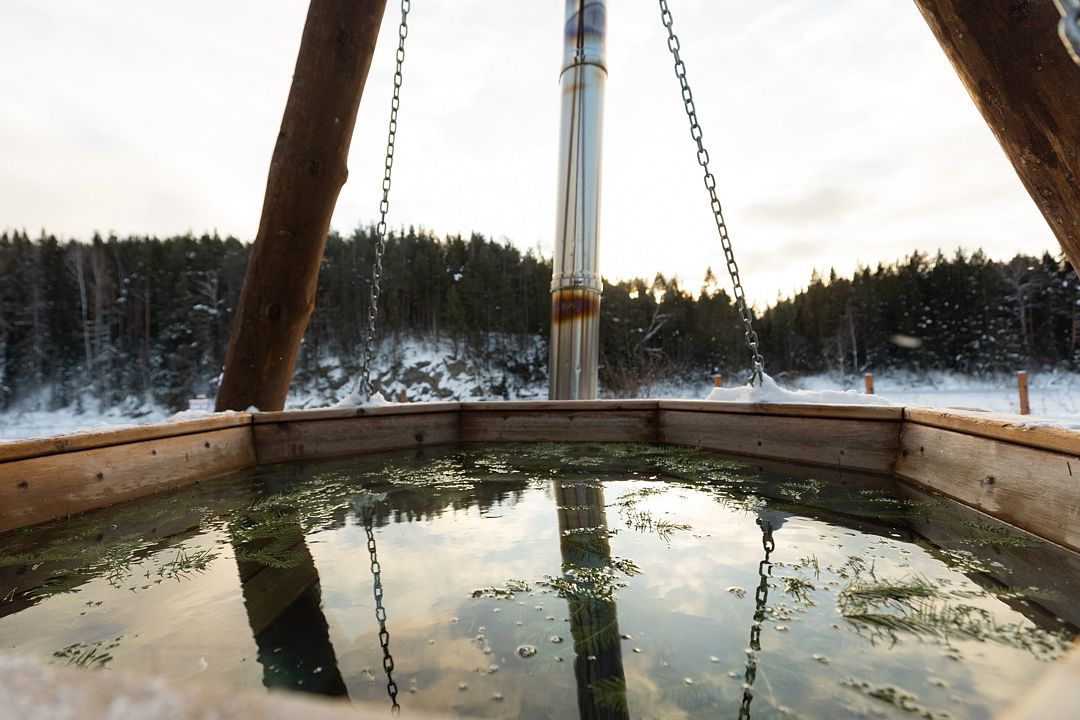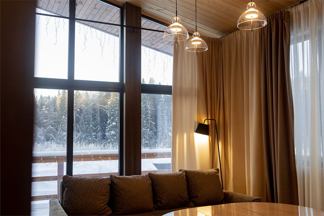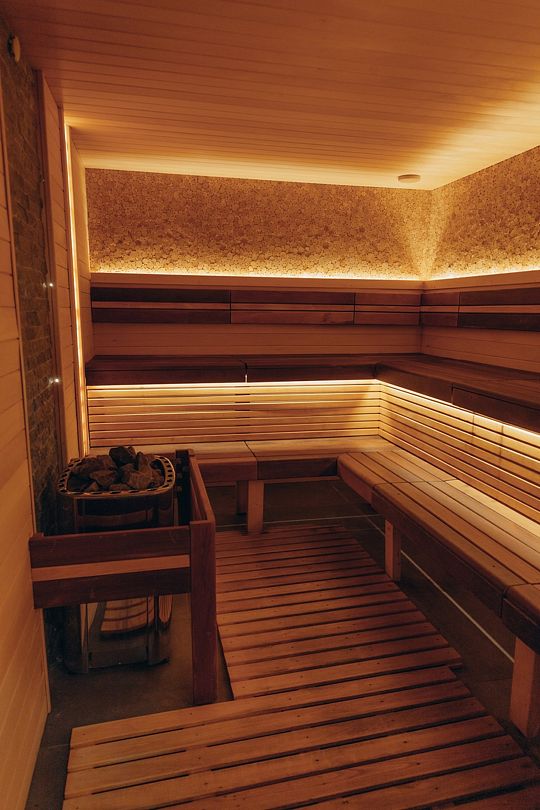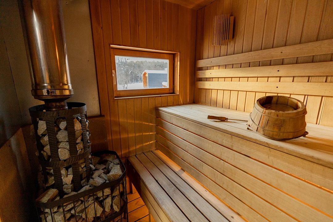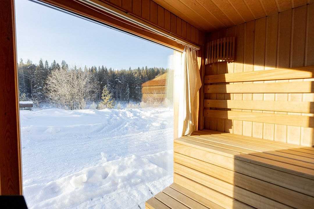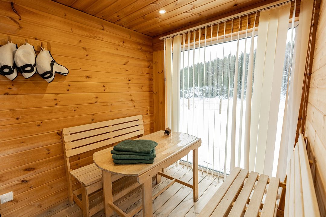 После освежающего купания в бассейне с панорамными окнами гости могут насладиться атмосферой можжевеловой сауны. Здесь, вдыхая свежий аромат хвои, вы сможете снять усталость и восстановить силы.