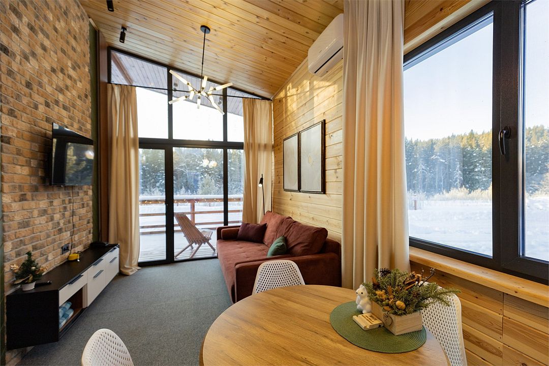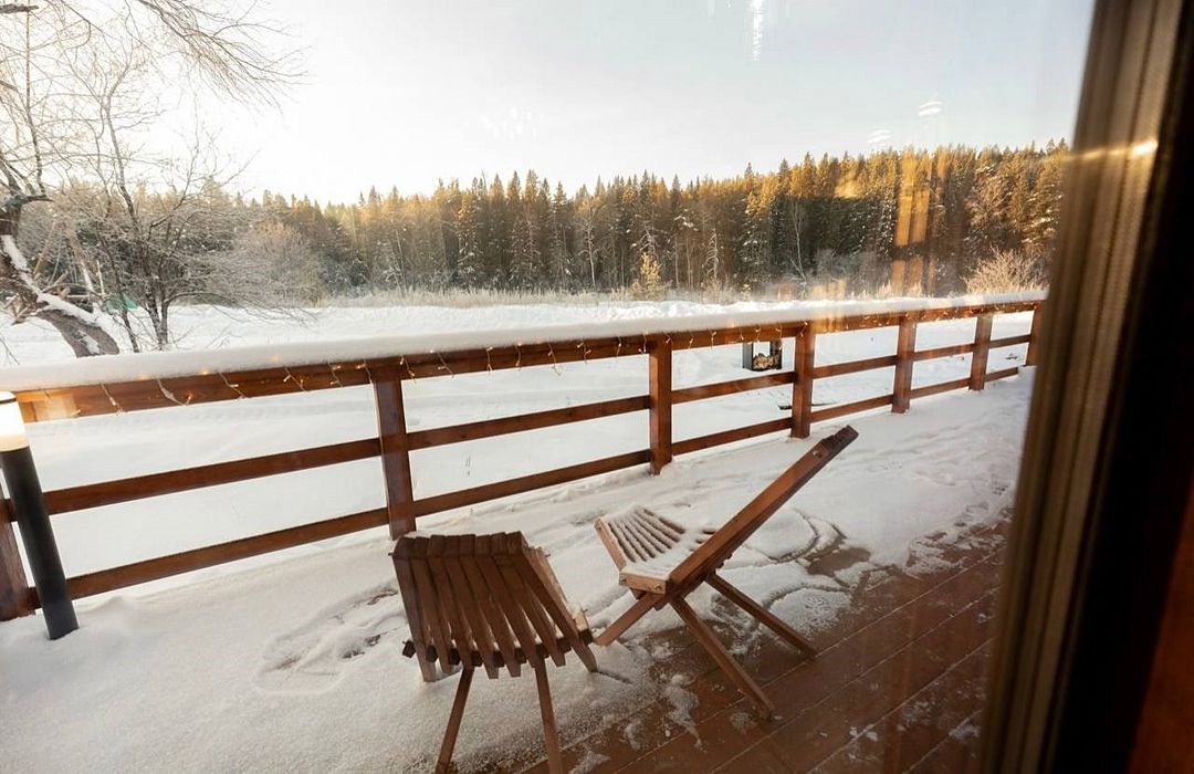 Уютный СПА-комплекс предлагает прекрасные условия для отдыха — гости могут насладиться купанием в бассейне, а также полюбоваться живописными панорамными видами реки Туры, леса и яблоневого сада, расслабившись на шезлонгах.