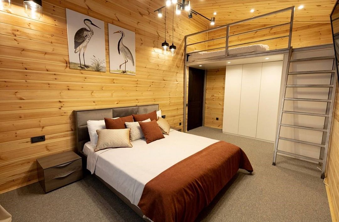 Окружающая территория полна живописных локаций: от уютных современных домиков до живописного соснового леса, а также удивительной излучины реки, создающих идеальные условия для незабываемых фотосессий.