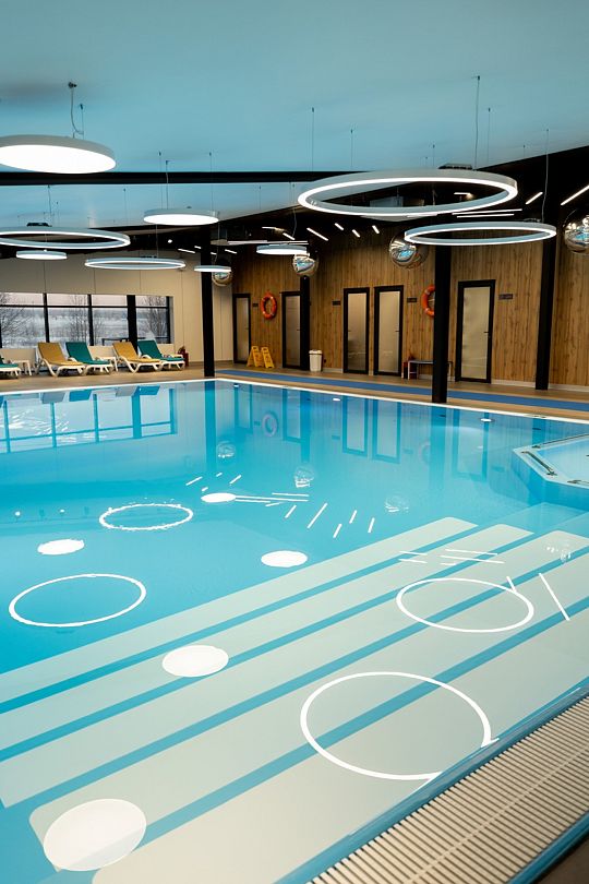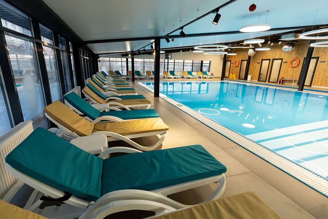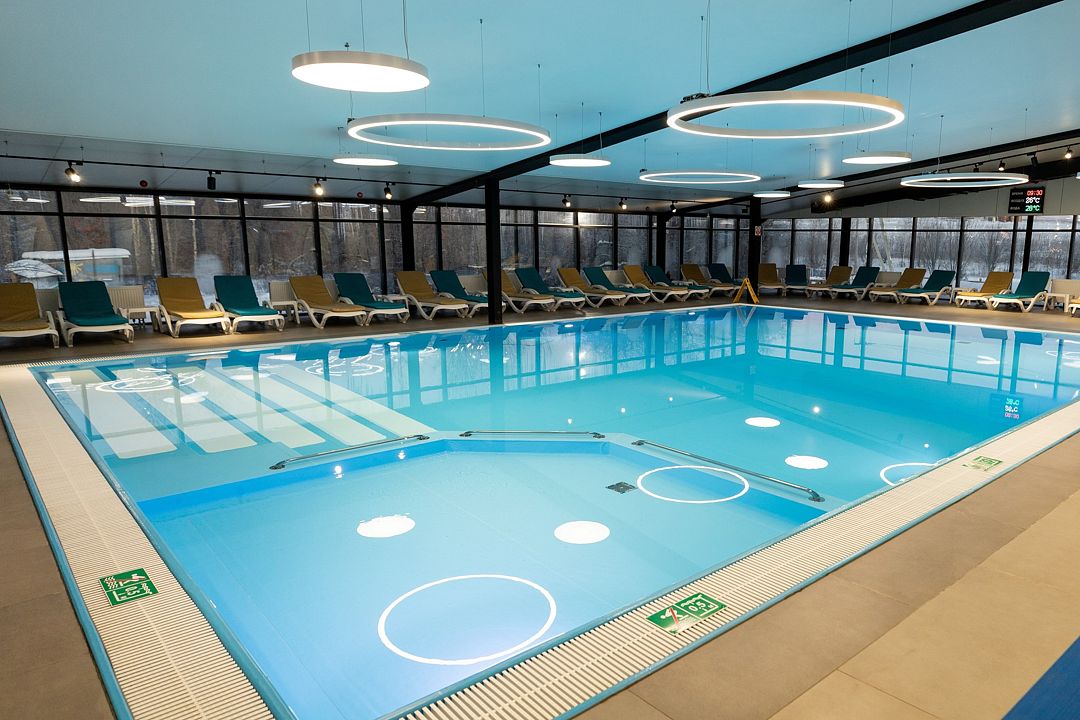 Тип бассейна: крытый бассейнВода в бассейне: подогреваемый бассейнРядом с бассейном: шезлонги, бар у бассейнаТемпература в бассейне: 28 °CВремя работы: от 09:00 до 21.00Глубина (диапазон): от 50 до 150 смПериод работы: круглогодичноУютный СПА-комплекс предлагает прекрасные условия для отдыха — гости могут насладиться купанием в бассейне, а также полюбоваться живописными панорамными видами реки Туры, леса и яблоневого сада, расслабившись на шезлонгах.