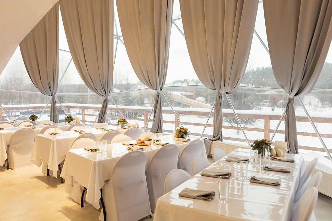 Шатер в загородном клубе «Яблоневый сад» идеально подходит для мероприятий любого формата — от свадебных торжеств до бизнес-презентаций и спортивных занятий. Он вмещает до шестидесяти пяти гостей за банкетными столами и ста тридцати в формате фуршета, а большое панорамное окно открывает захватывающий вид на реку Тура.