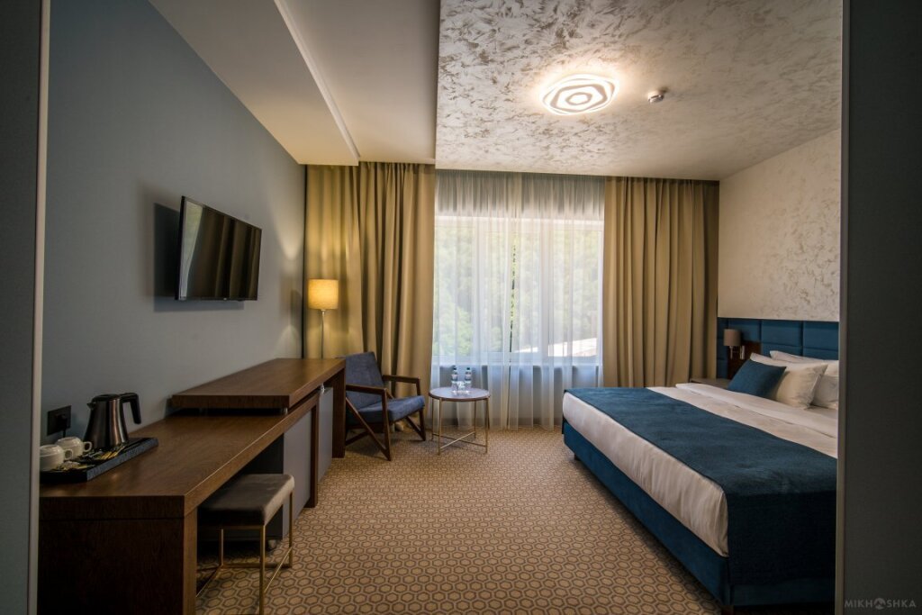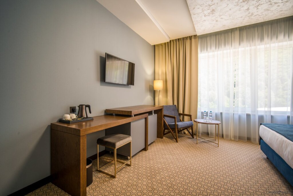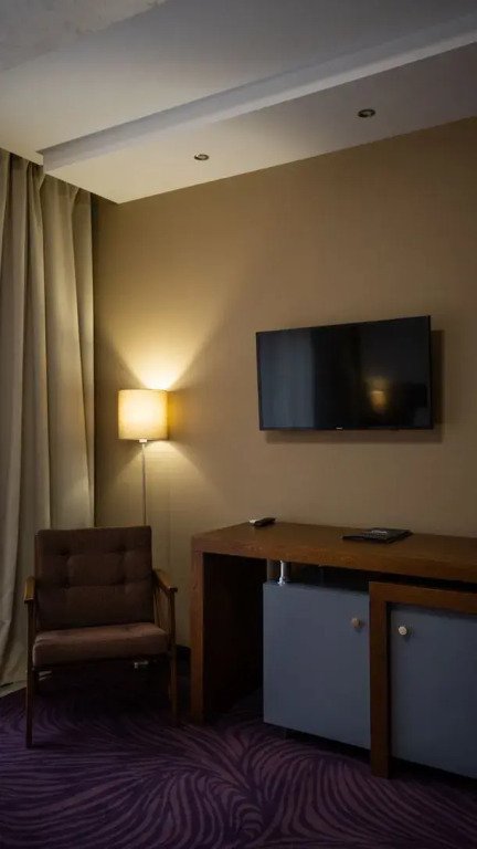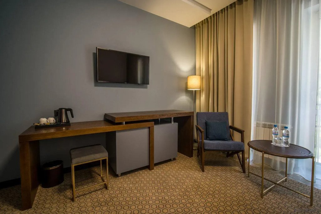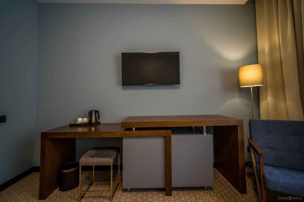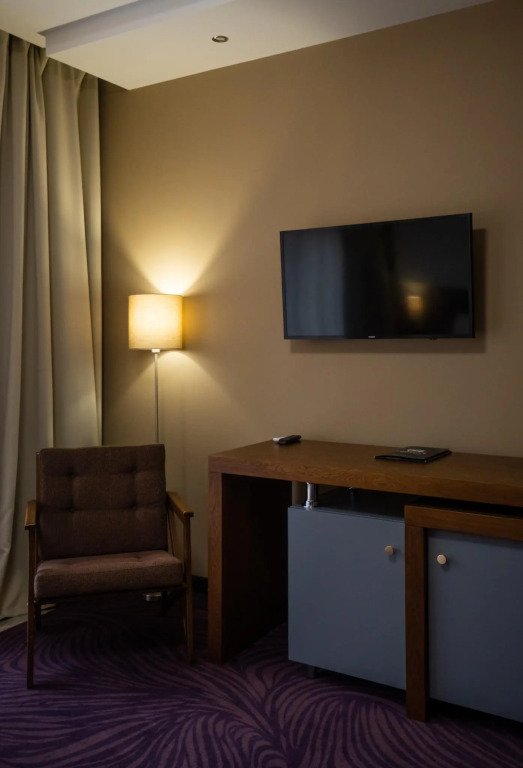 Номер оснащён телевизором, сейфом, феном, гладильными, чайными и кофейными принадлежностями.