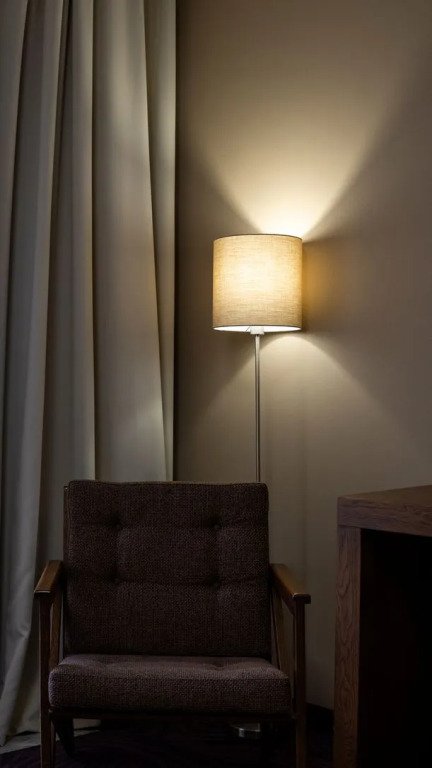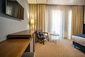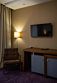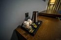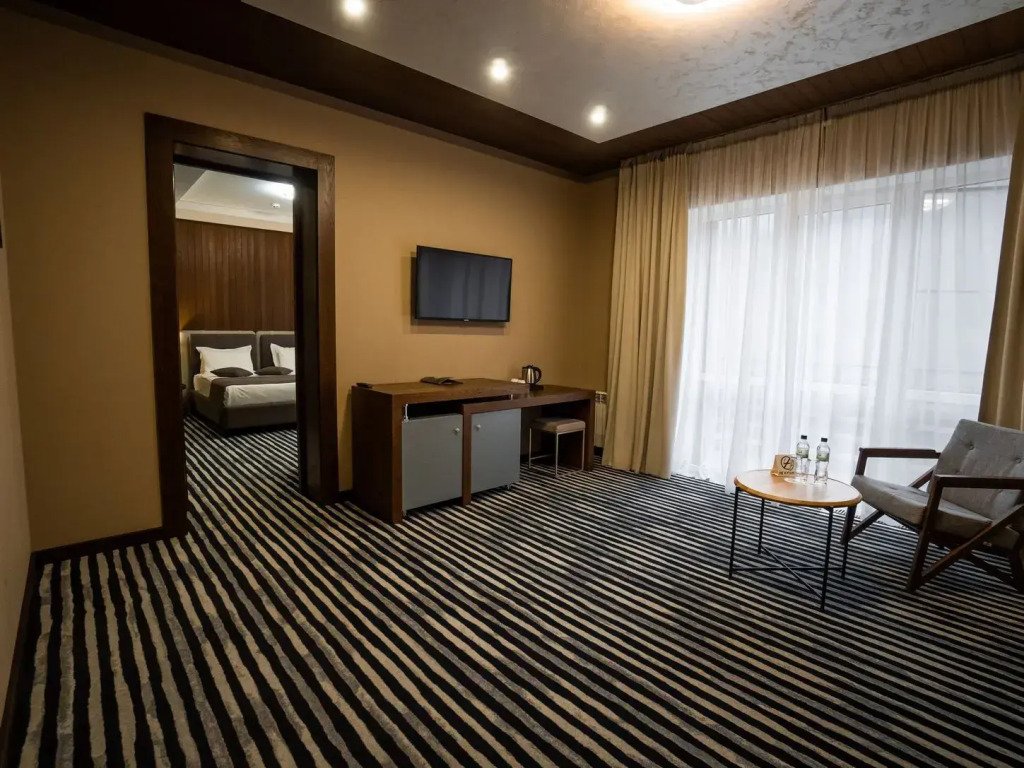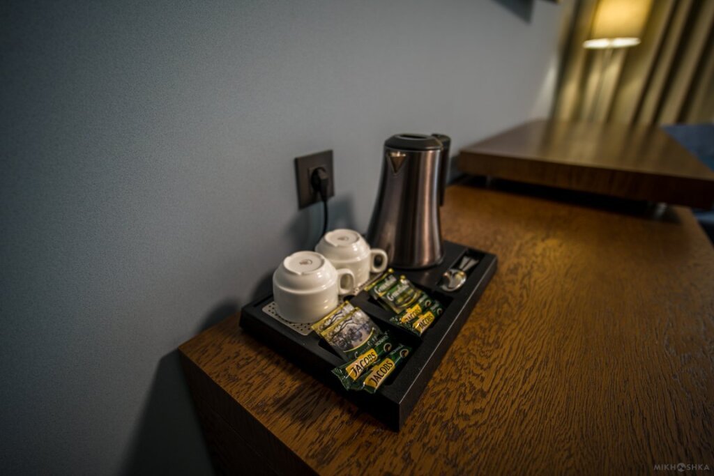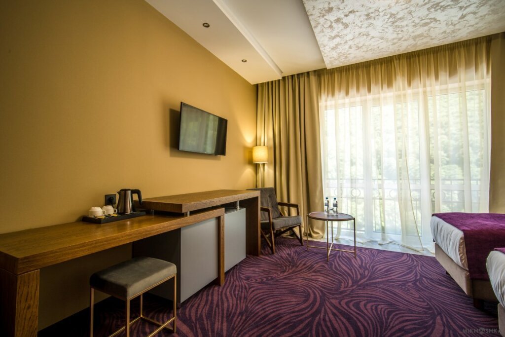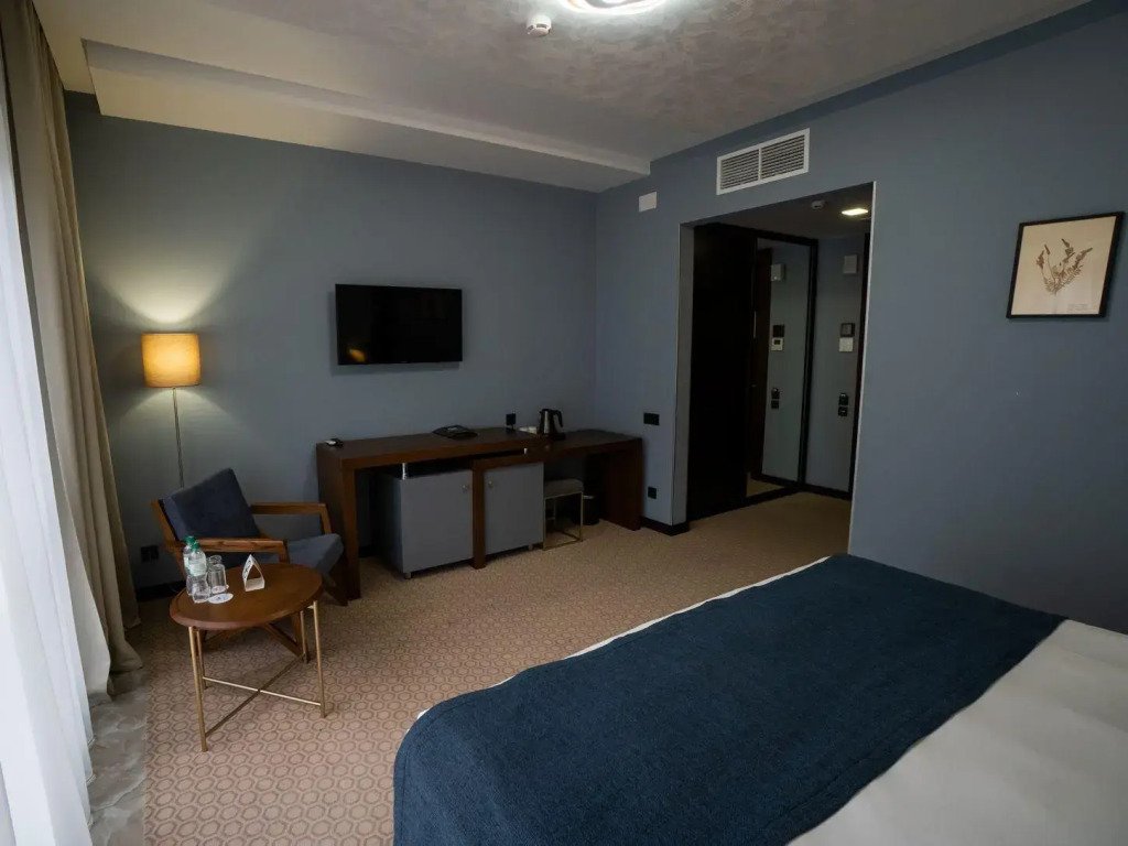 Номер оснащён телевизором, сейфом, феном, гладильными, чайными и кофейными принадлежностями.