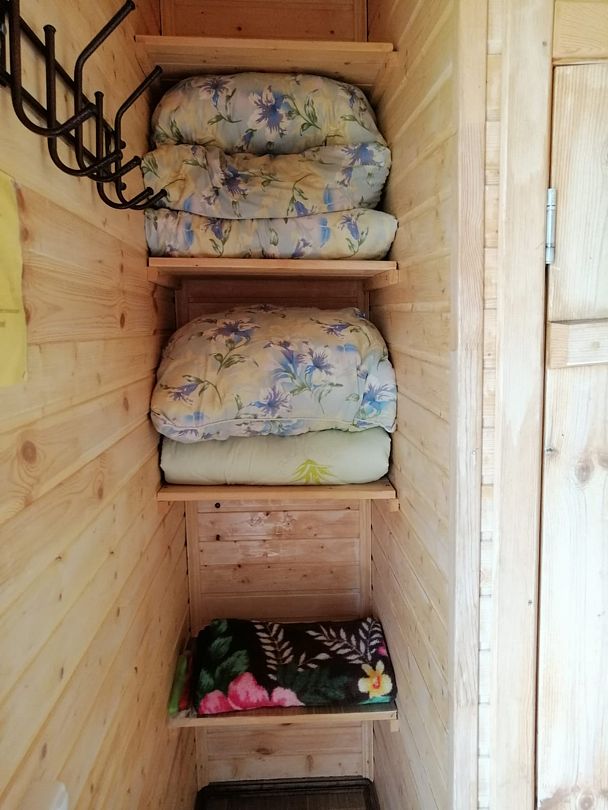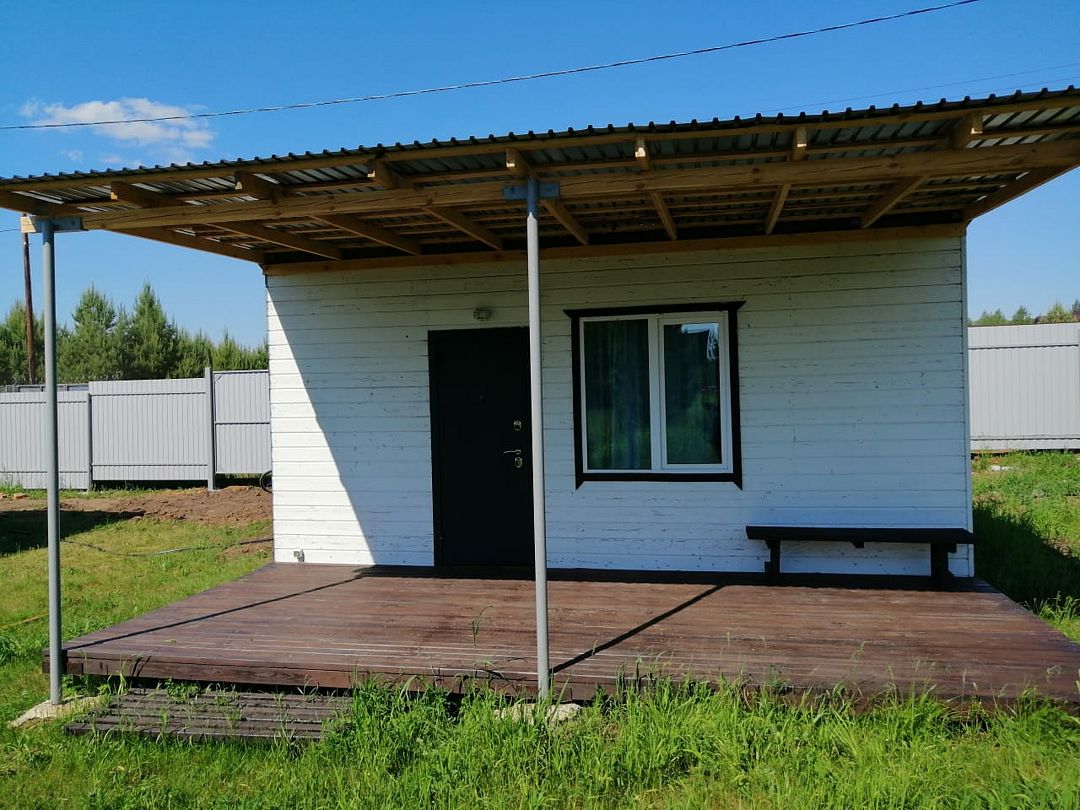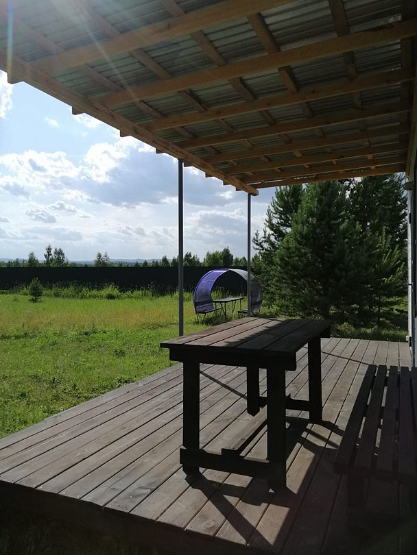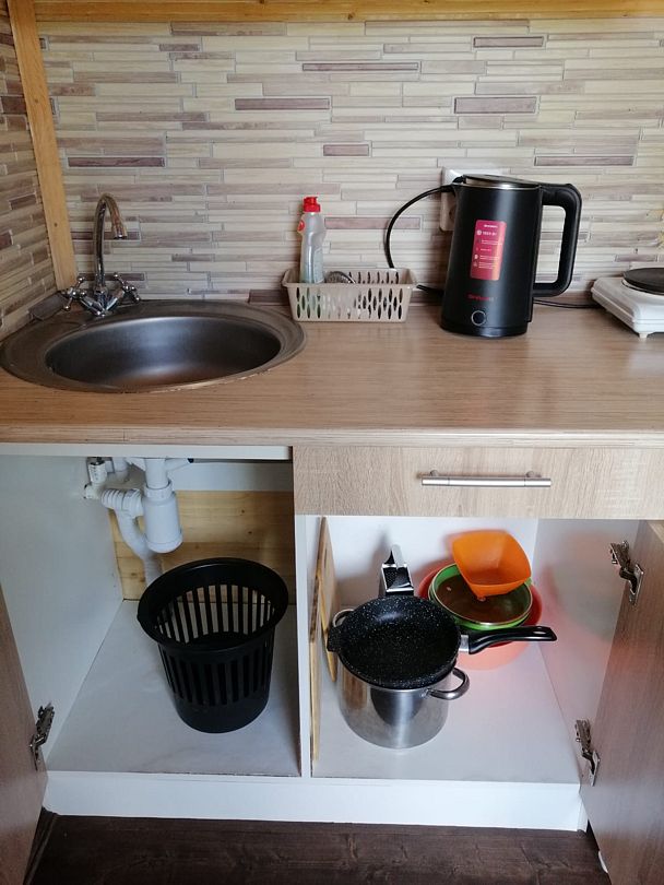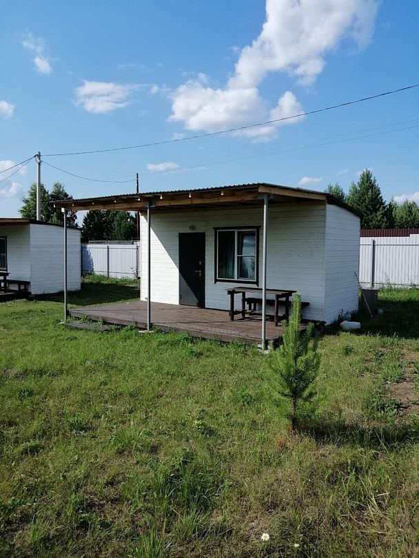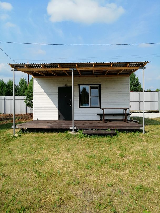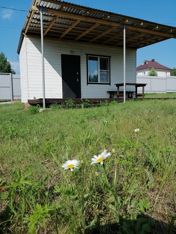 Небольшой уютный дом со своей кухонной зоной, туалетом, тремя кроватями, зеркалом, столом, двумя табуретами, всей необходимой посудой и большой террасой. На террасе большой стол и скамья. Душ летний на улице.