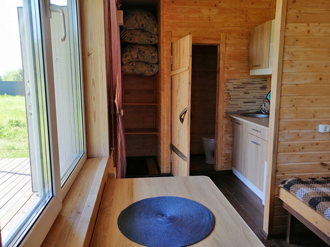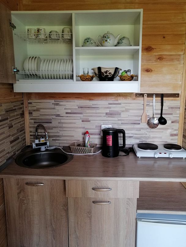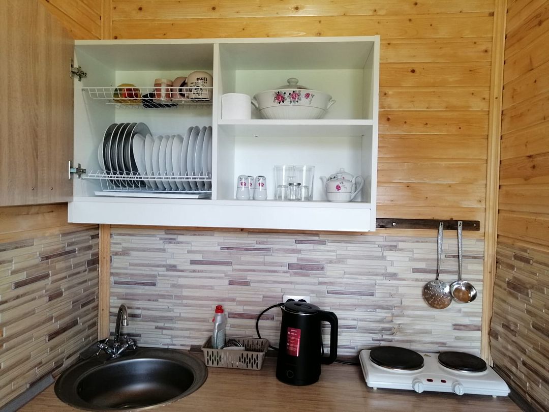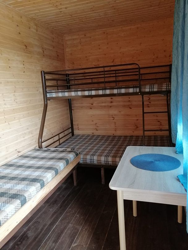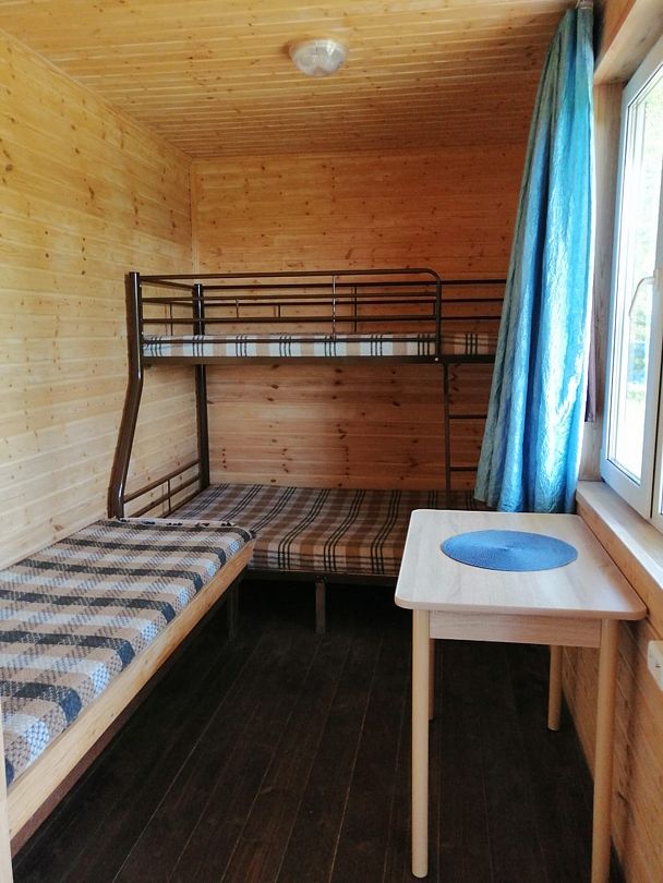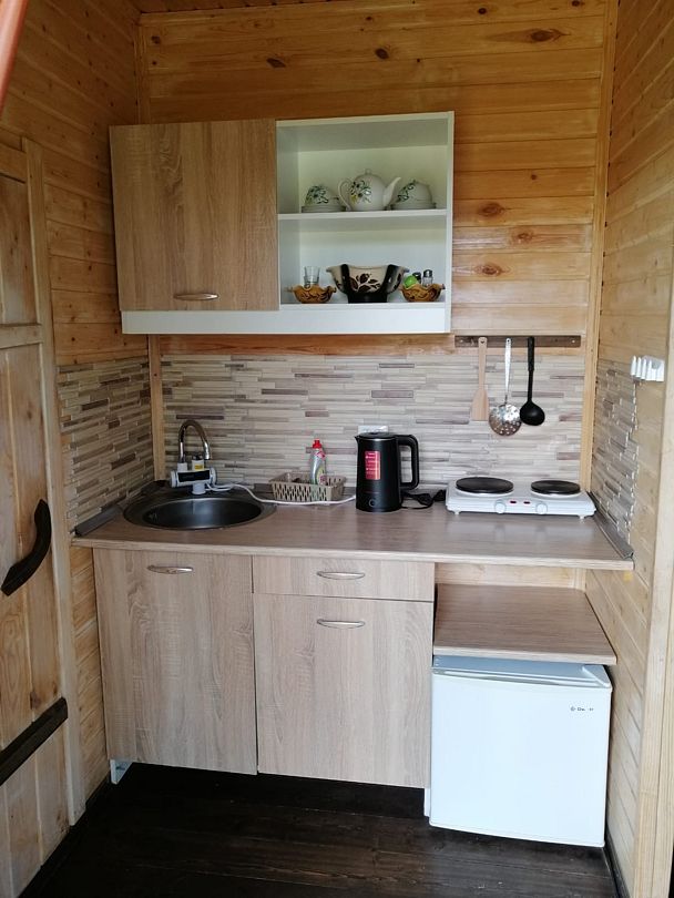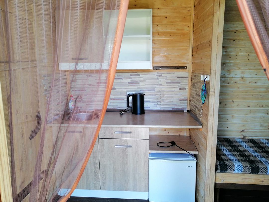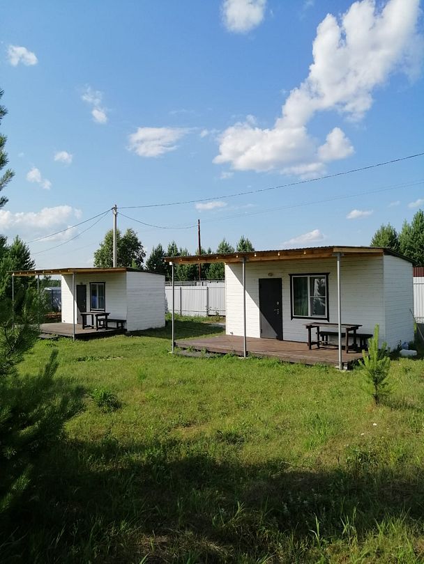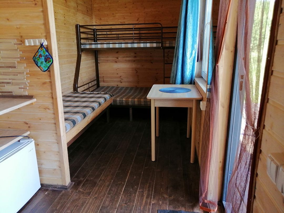В домиках созданы все условия для комфортного проживания: небольшая кухня с необходимой посудой, туалет, обеденный стол, полки для вещей и четыре спальных места. Постельное белье предоставляется. Гости могут играть в бадминтон, настольные игры, жарить шашлыки и наслаждаться общением в кругу близких.
