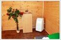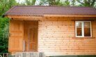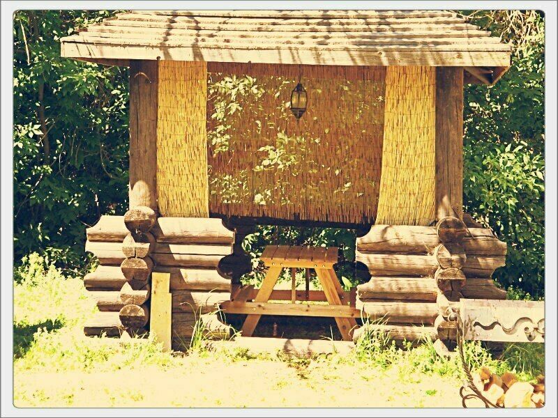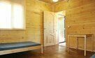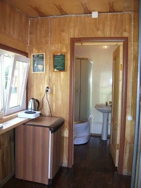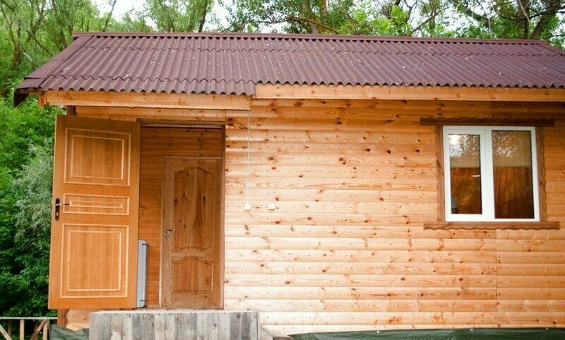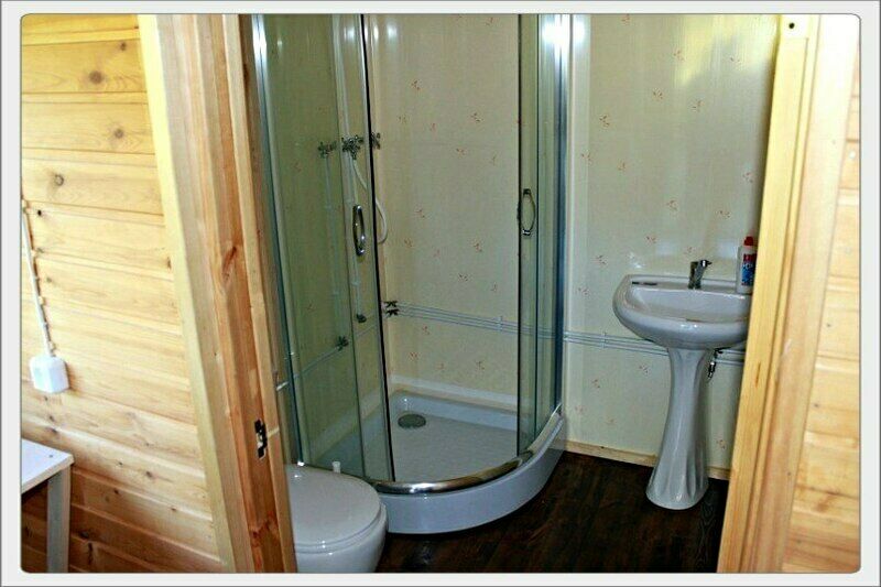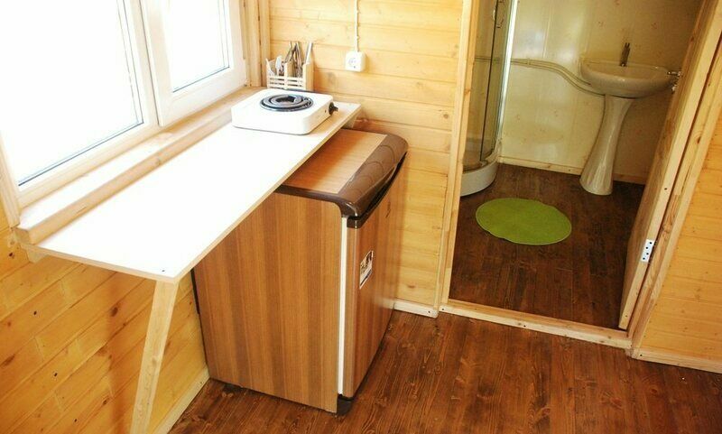 Уютный деревянный домик с электричеством, водопроводом и санузлом. Около домиков расположены беседки или столы под тентом.