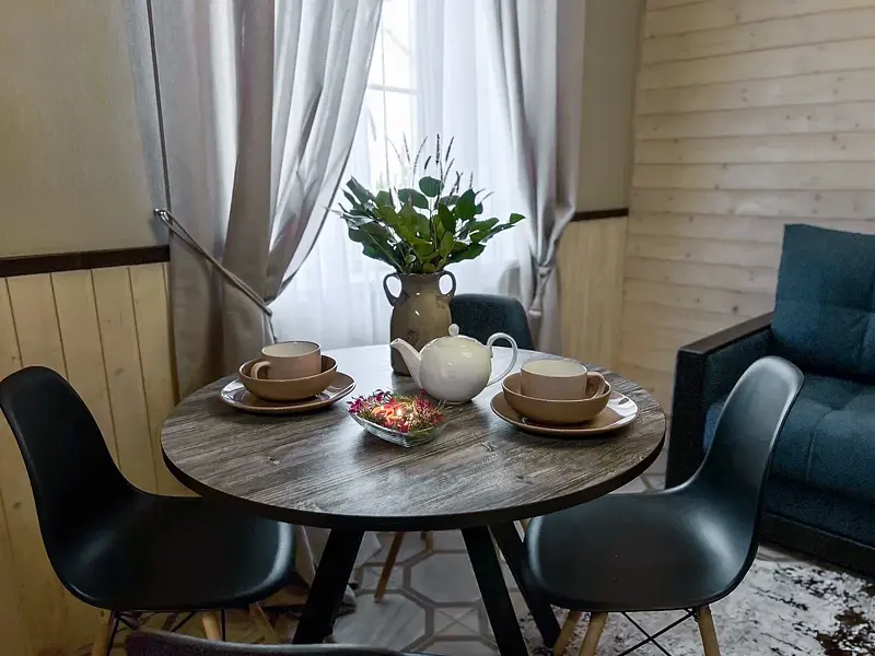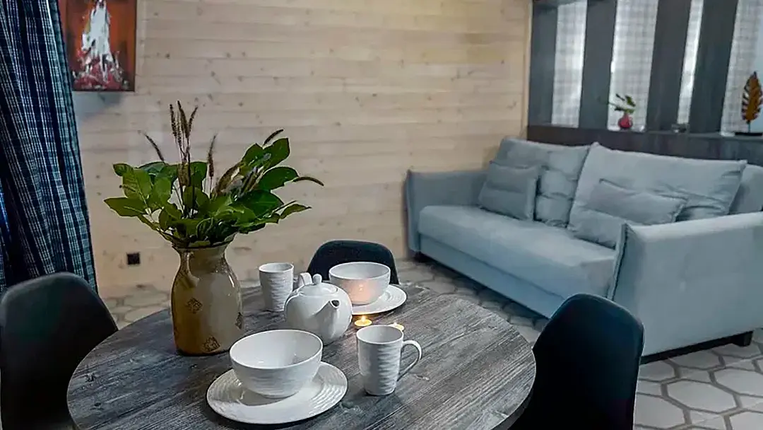 Домик премиум класса полностью оборудован для приятного и комфортного отдыха. Дизайнерская посуда, стулья, изготовленные специально по заказу.