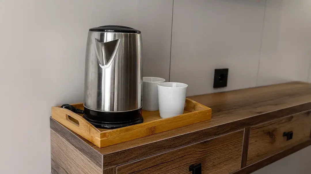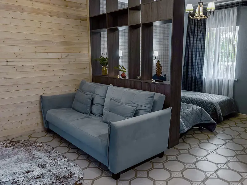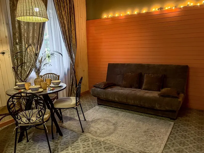 Оснащение глэмпинга: кровати спринг-бокс, диван, тумба прикроватная 2 шт., кресла 2 шт., столик чайный 1 шт., полка под ТВ 1 шт., гардеробный шкаф 1 шт. Кухонный гарнитур, посудомоечная машина, вытяжная система, раковина, смеситель, индукционная плита.