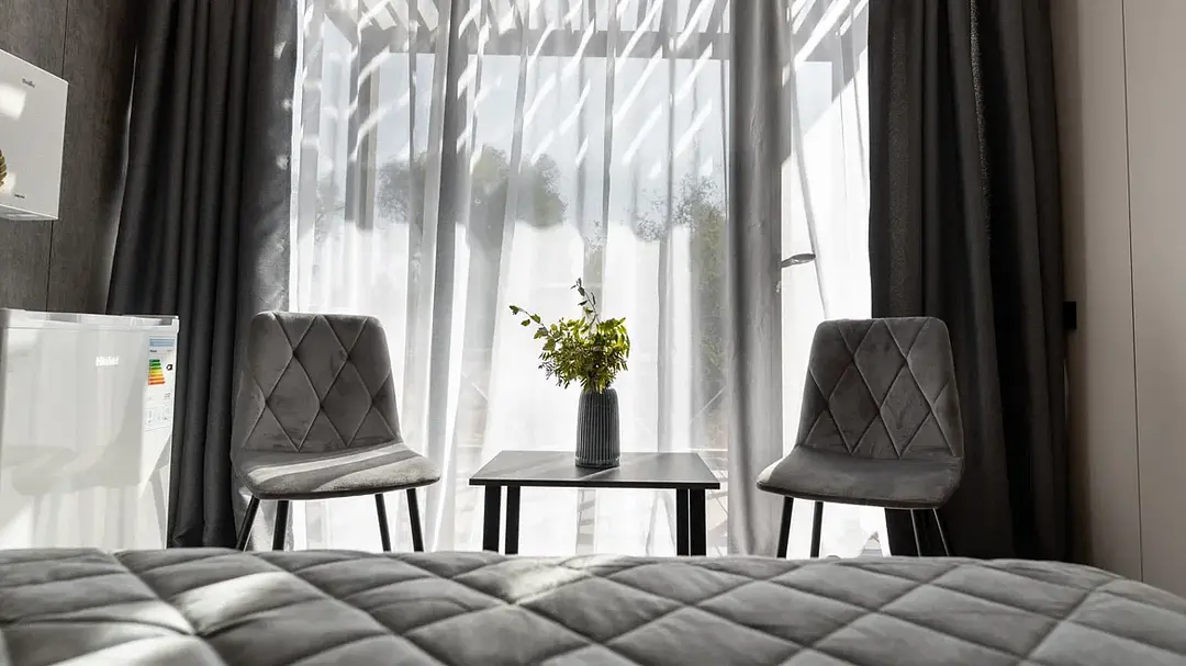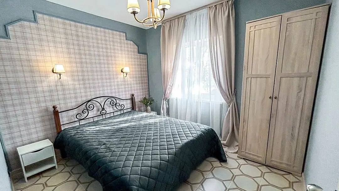 Мебель: кровати спринг-бокс 2 шт., тумба прикроватная 2 шт., кресла 2 шт., столик чайный 1 шт., гардеробный шкаф 1 шт.