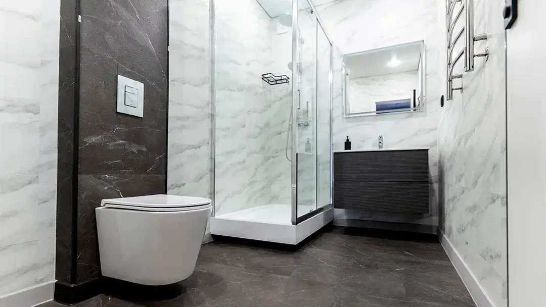 Комплексное оснащение санузла: душевая перегородка, раковина с тумбой, зеркало с подсветкой и подогревом, полотенцесушитель, унитаз.