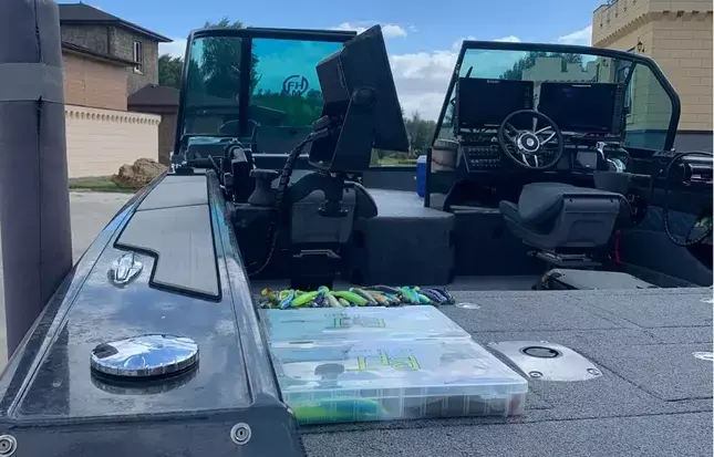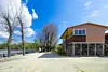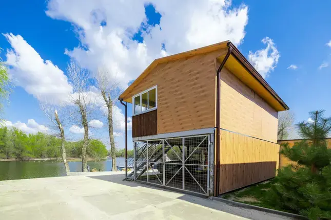 На первом этаже домика размещена парковочная площадка для автомобиля и лодки.
