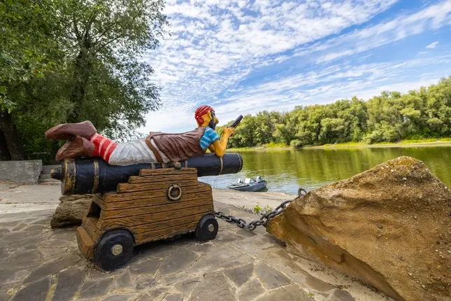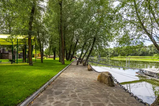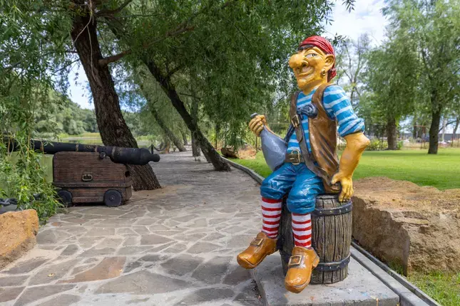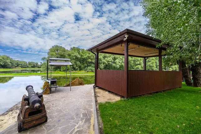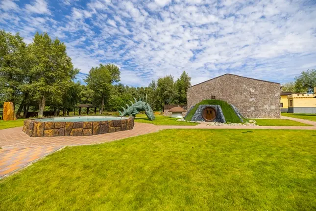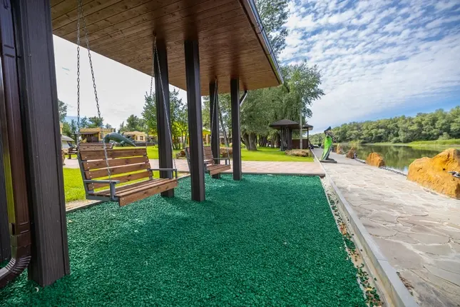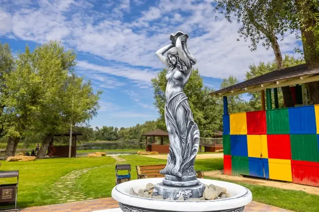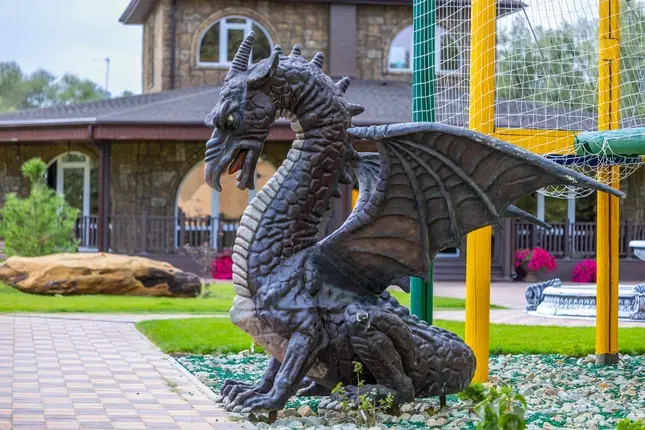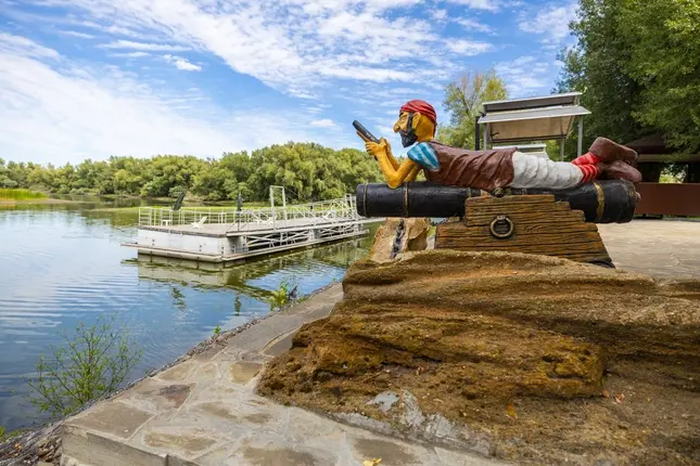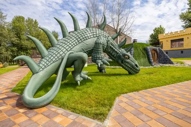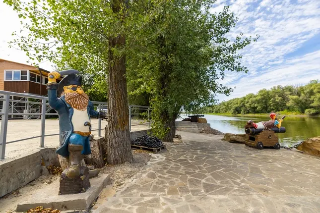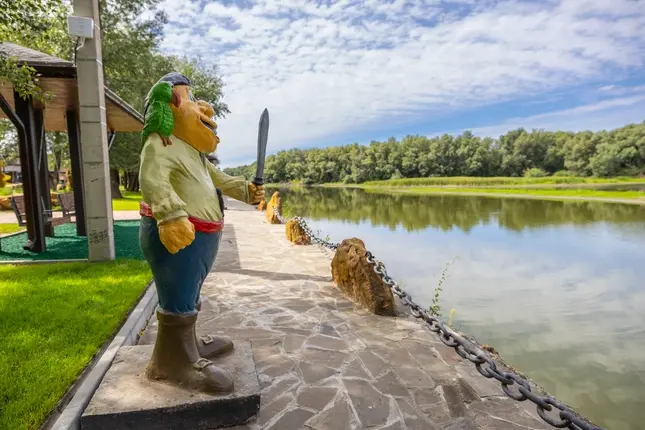 Вас ждут удивительные авторские скульптуры: драконы, рыцари, пираты и тематические зоны, а также крытые детские площадки, уютные беседки на берегу реки, качели, пирсы и большая мангальная зона.
